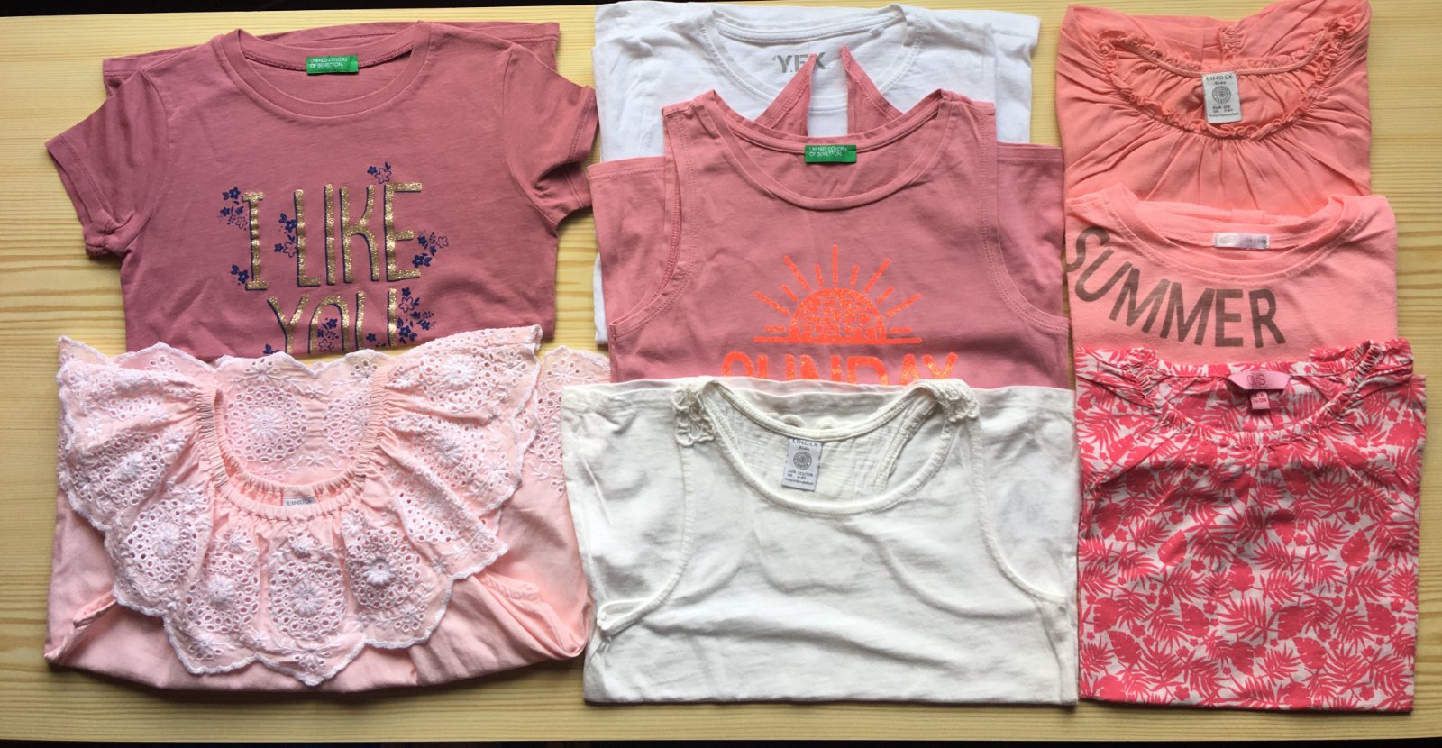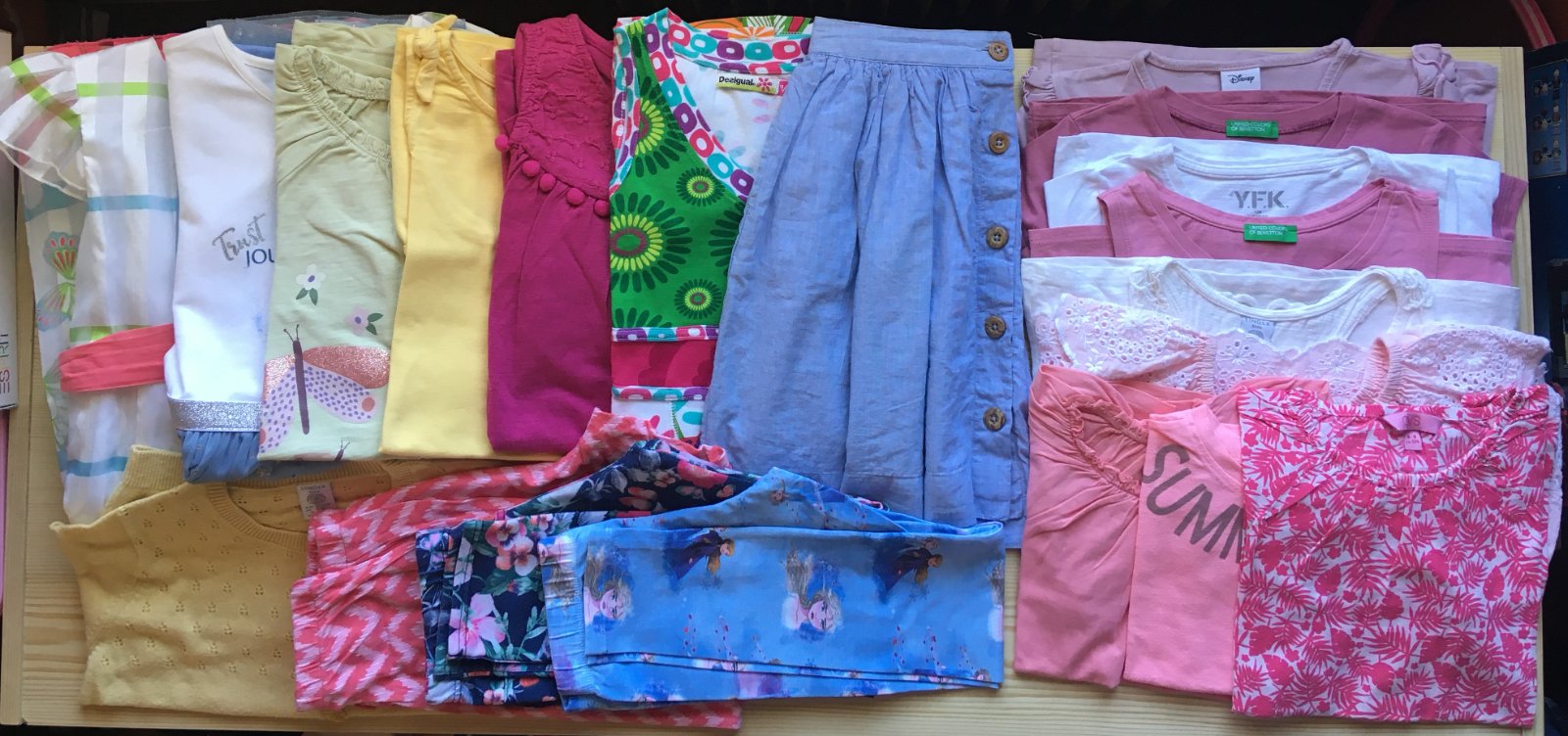 21ks. Väčšina vecí ako nové, minimálne nosené. Komplet na leto značiek Lindex, Benetton, Calzedonia, Desigual. Všetky veci sú dvojčíslo 122/128, zodpovedajú skôr veľkosti 128.