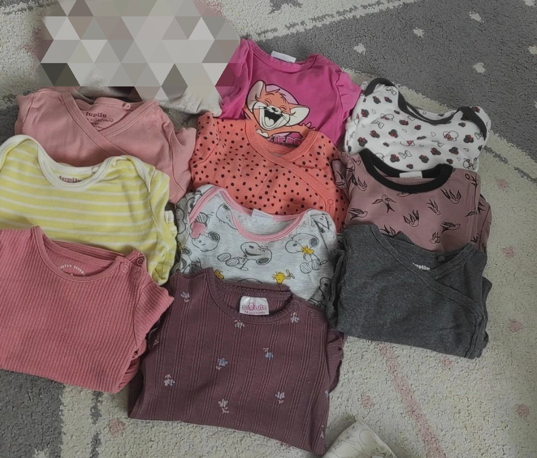 ružové šaty Sinsay 68 veľkosť 3€ kvietkave šaty F&F 3-6 mesiacov 3€ tričko Lupilu 62/68 veľkosť 3€ tepláky Koala baby 68 veľkosť 3€ legínky Disney 68 veľkosť 2€ alebo spolu 12€ všetko ako nové