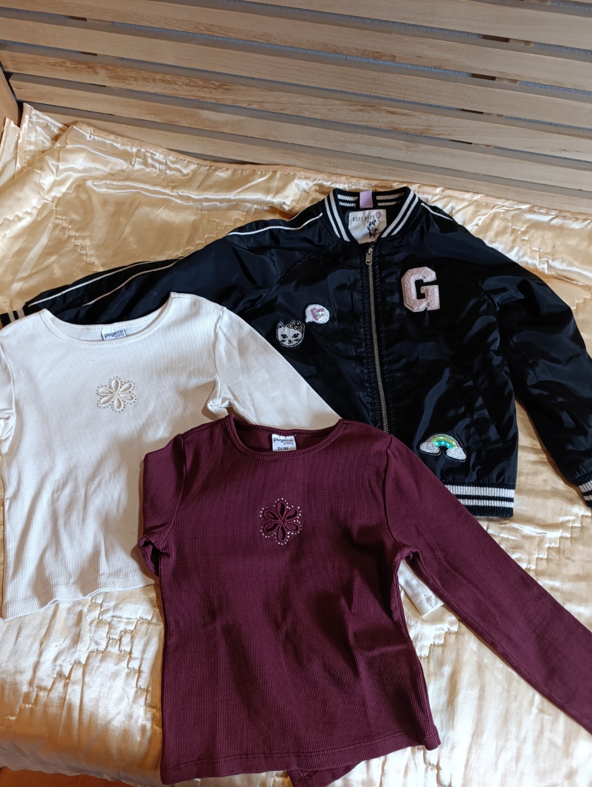 Mikinka 122, celková dĺžka 47cm vpredu , 50cm Rukáv 38cm Vpredu 2male fliciky od farby ( nie je to moc vidno) Tricko 122/128 , Celková dĺžka 44cm, Rukáv 44cm Na1 tukave na patente flak od farby