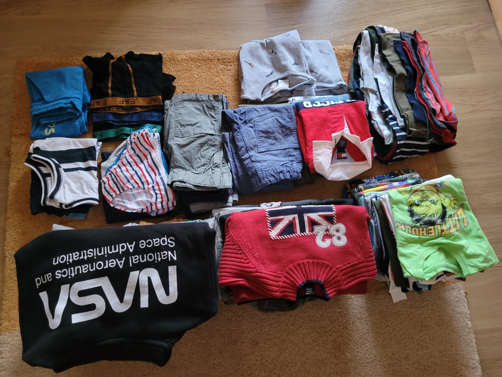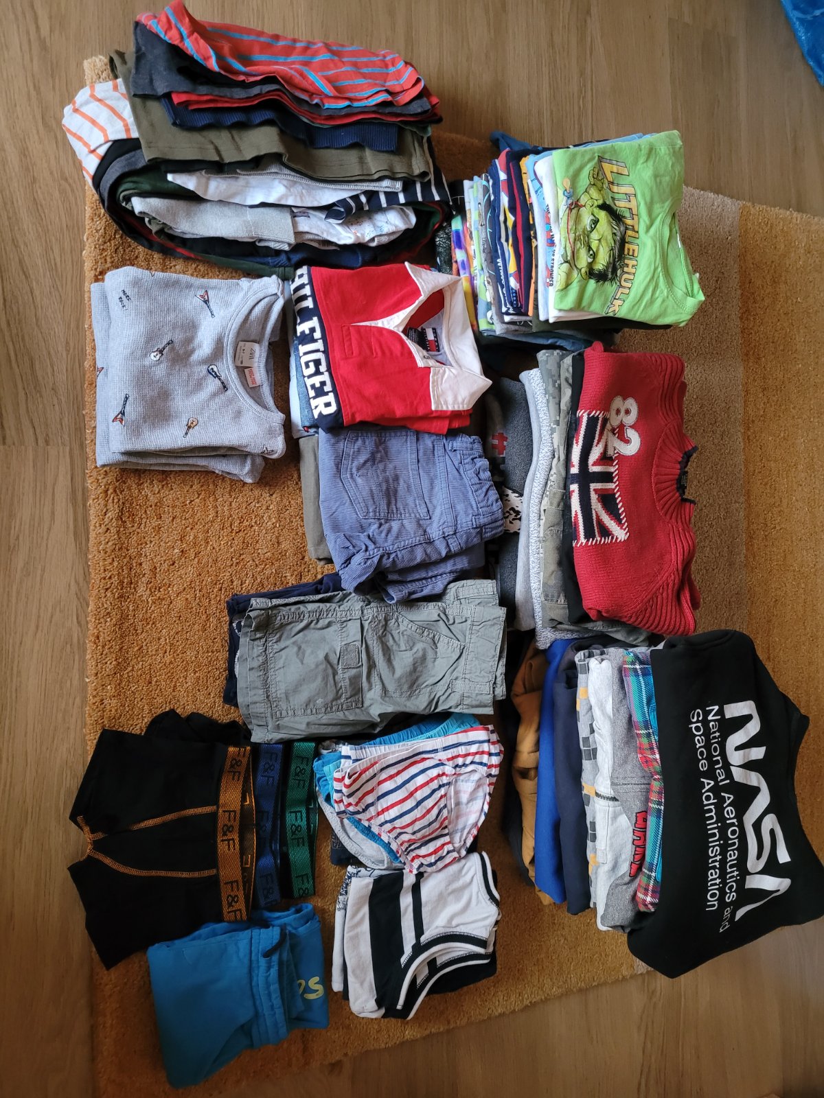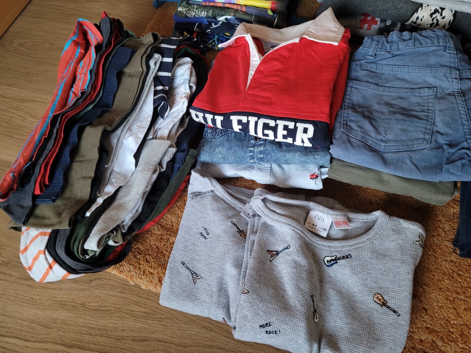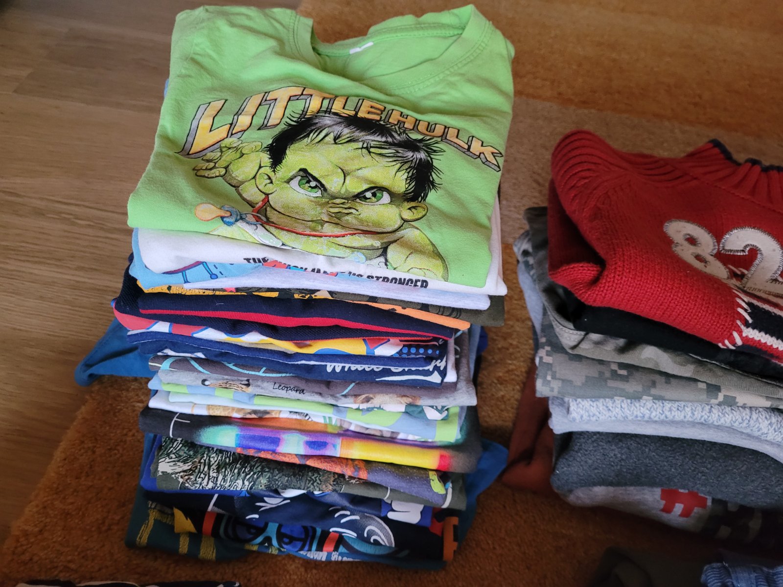 Detské oblečenie na chlapca, veľkosť od 3 do 7 rokov, veľkosť 98-122 váha 10,3 kg: mikiny s kapucou/10ks,tričká dlhý rukáv/12ks,tričká krátky rukáv/29ks,košele/3ks, svetre a mikiny bez kapuce/9ks,nohavice/2ks, kraťasy/5ks,tielko/4ks,pyžamovy vršok/2ks,tepláky1x,spodky/15ks.