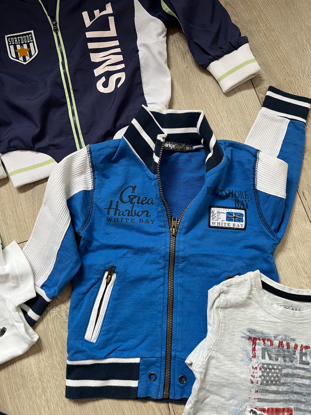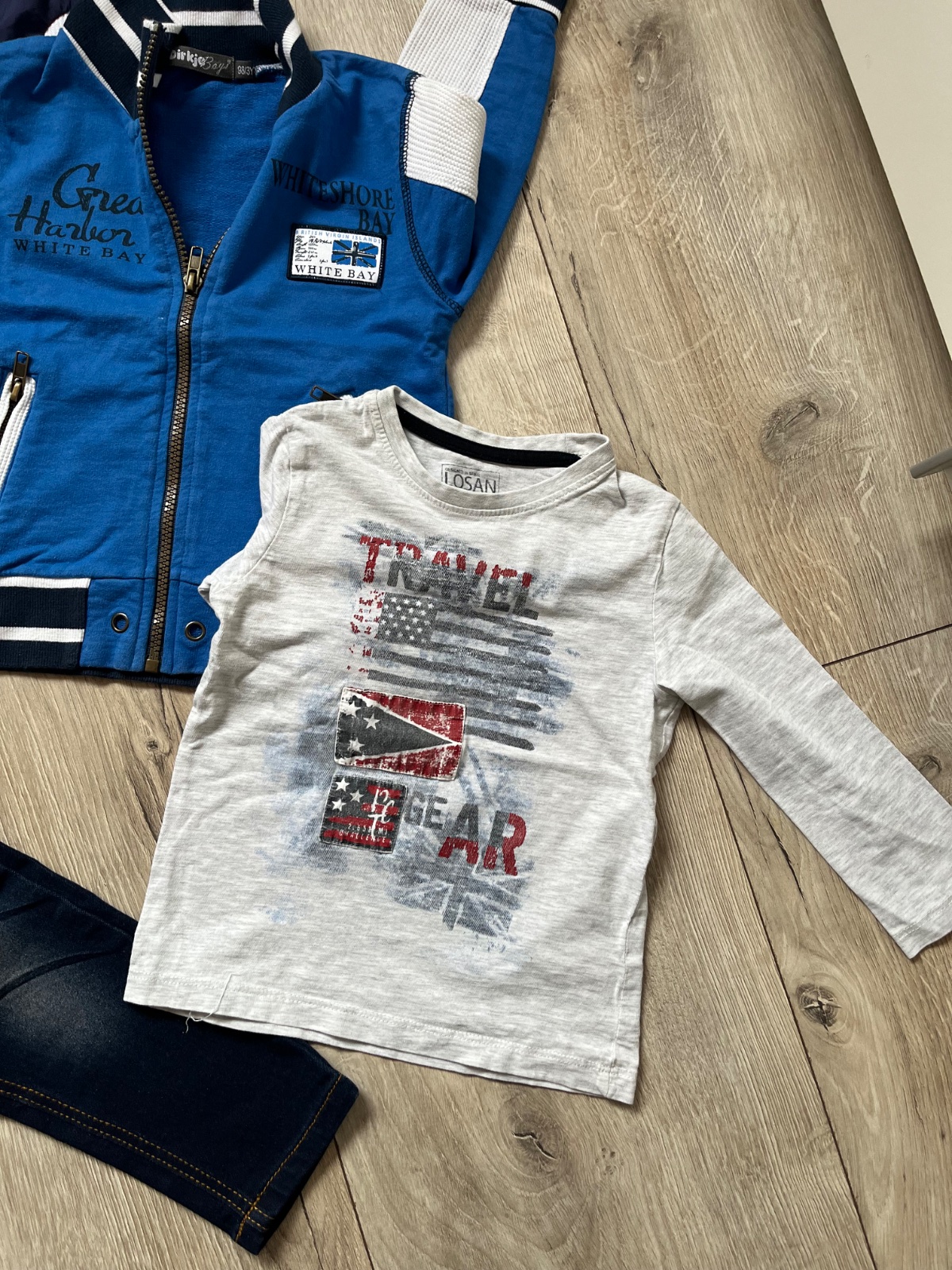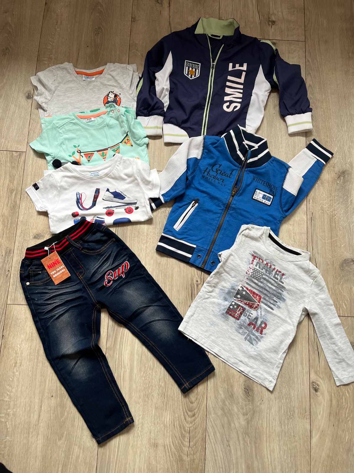 Balík obsahuje vetrovku, mikinu, tričko s dlhým rukávom, 3x tričko s krátkym rukávom a rifle nové s visačkou.