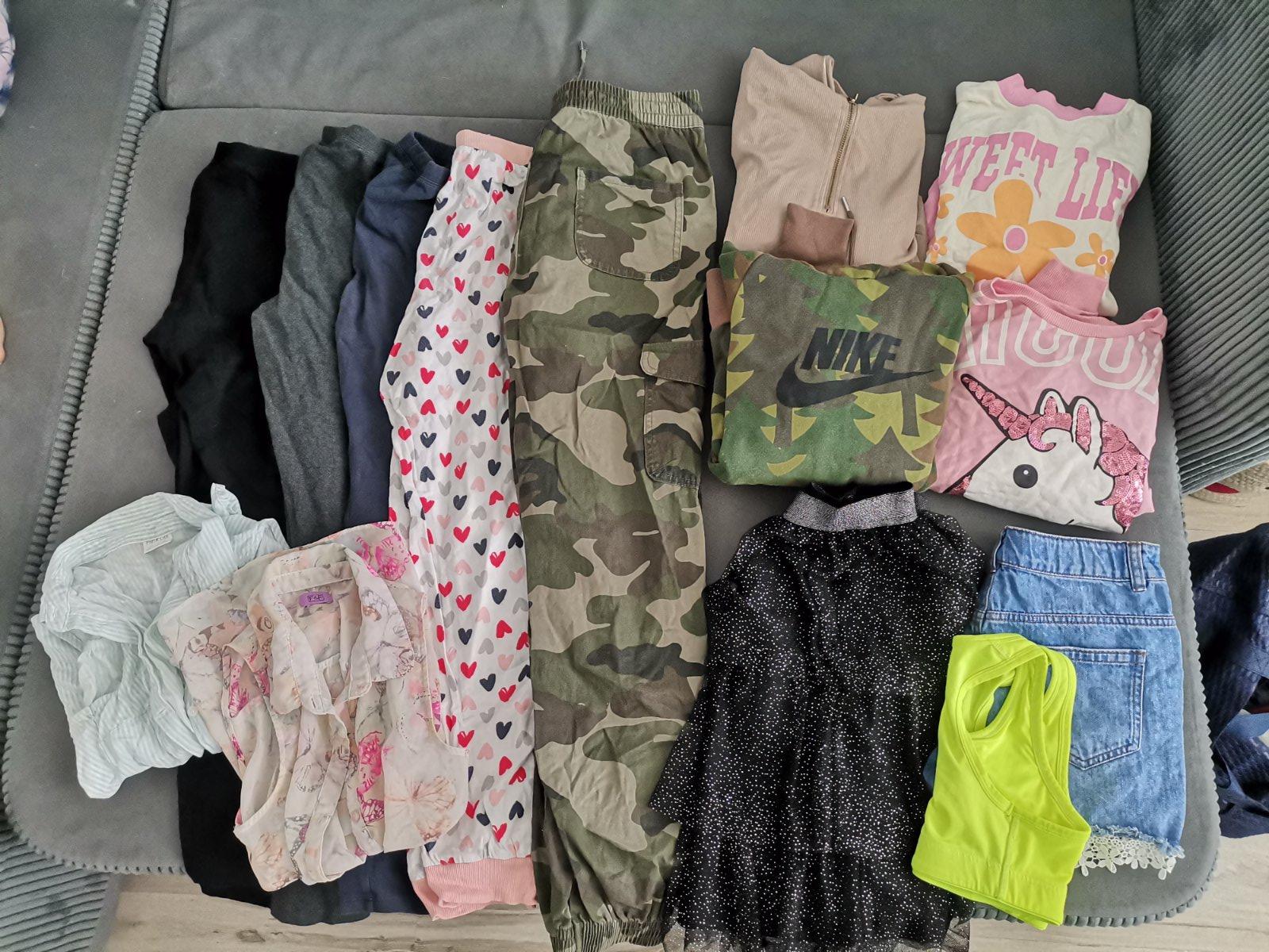 Balik 158/164 3x leginy, 1x pyžamove nohavice, 1x kapsace,. 2x mikina s kapucňou, 1x kratasy, 1x sukňa, 2x dlhé tričko, 2x koša bez rukávov, 1x športová lambada. Dobrý stav. Niečo je úplne nové, niečo málo nosené, niečo na donosenie.