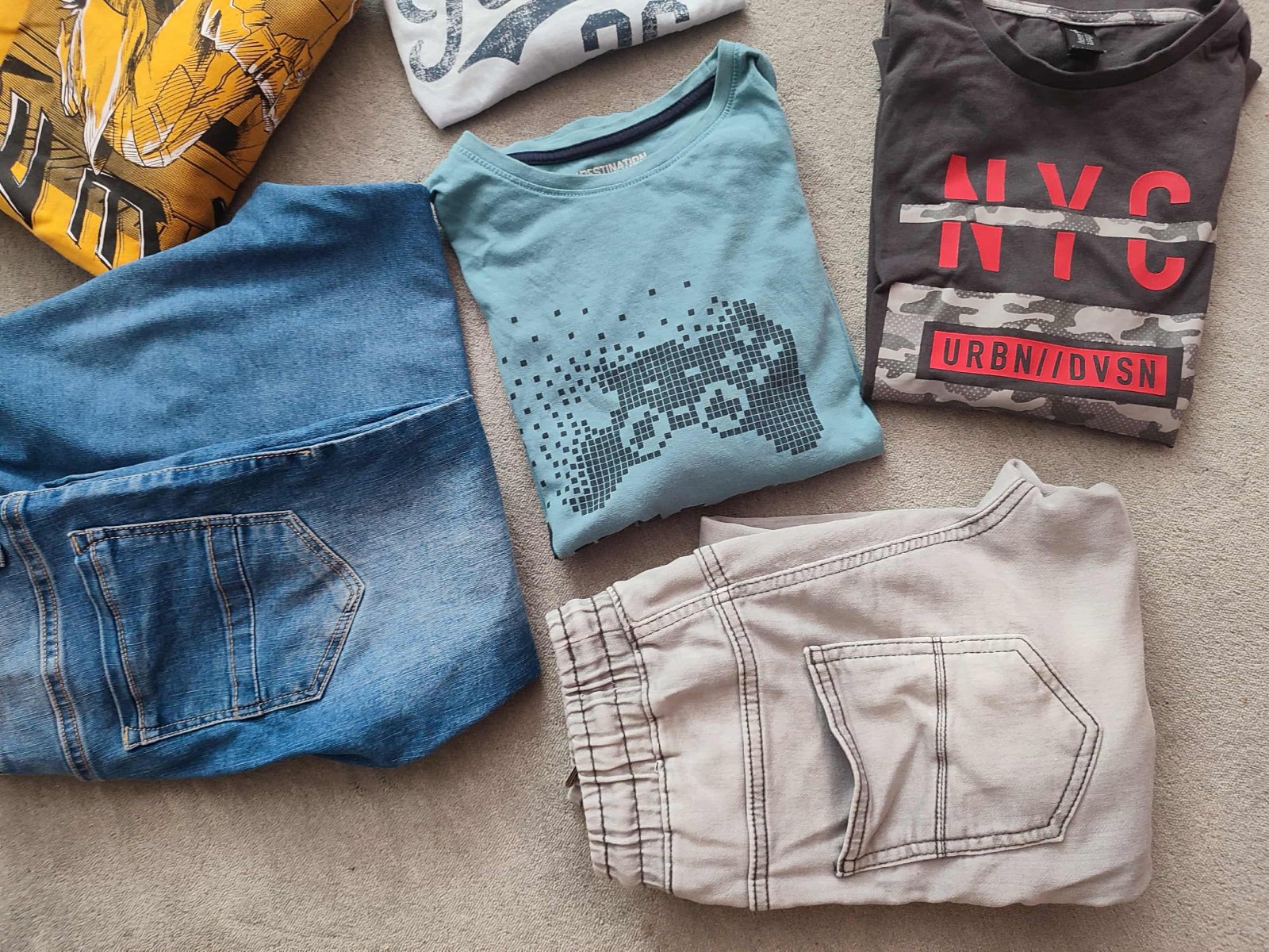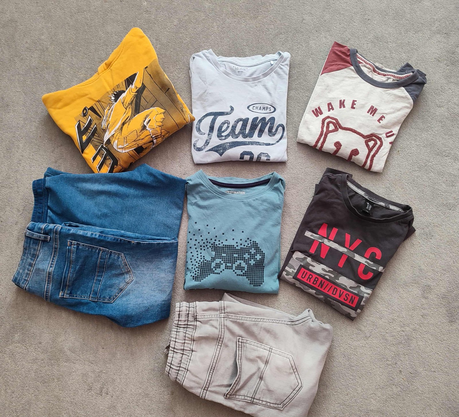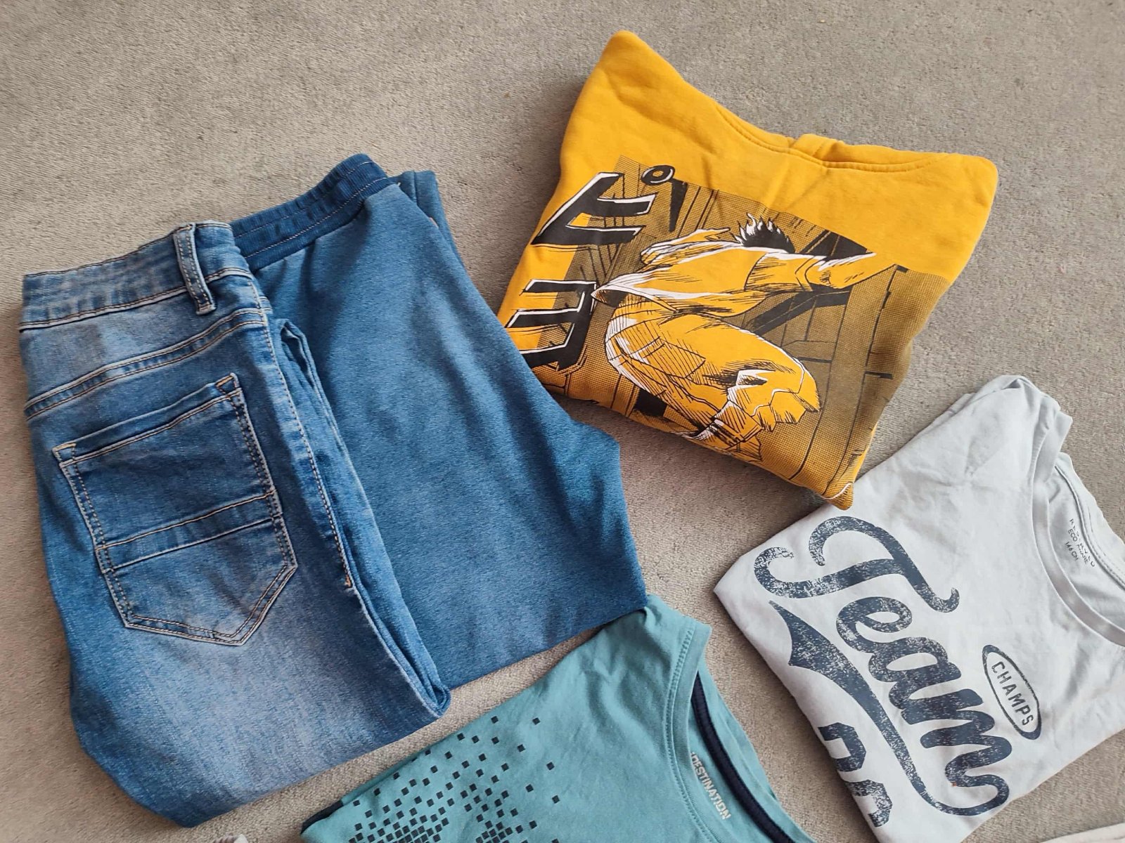 Balík oblečenia veľkosť 146 v dobrom nosenom stave rôznych značiek 1 mikina 4 tričká 3 rifly cena spolu 14€.