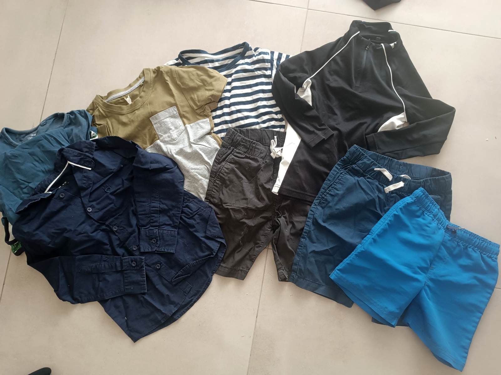 Všetko veľkosť 116, vesta, rifle (roztrhané kolená majú byť), tepláky a tričko s krátkym rukávom. Nosené bez poškodení.