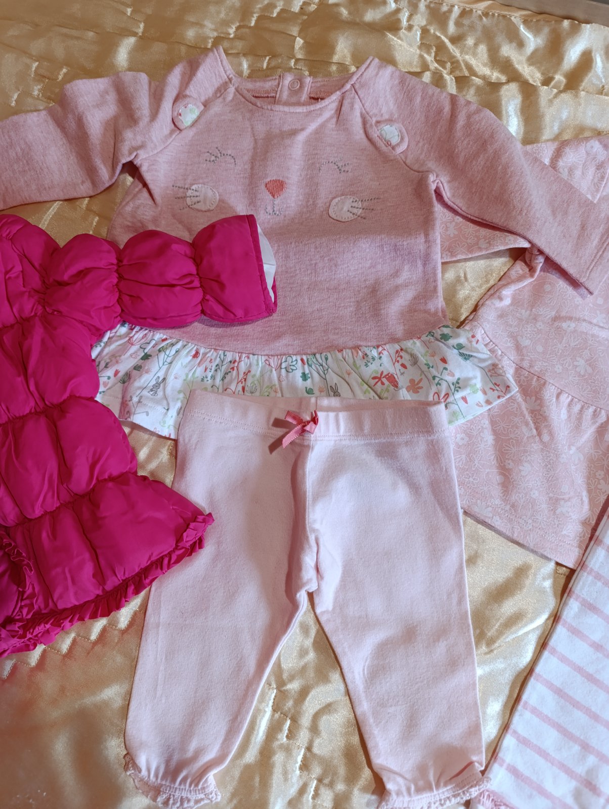 Mix oblecenia pre dievcatko vel.56-62 ( do 3mes.) Vo velmi dobrom stave, bez poskodeni , tip top stav Pyzamko, body, teplacky, kratasky ( vzadu na pase flak ) 2x rukavicky pre najmensich gratis!!!...