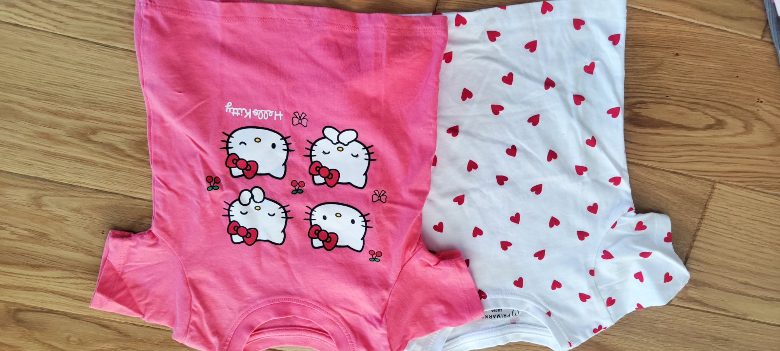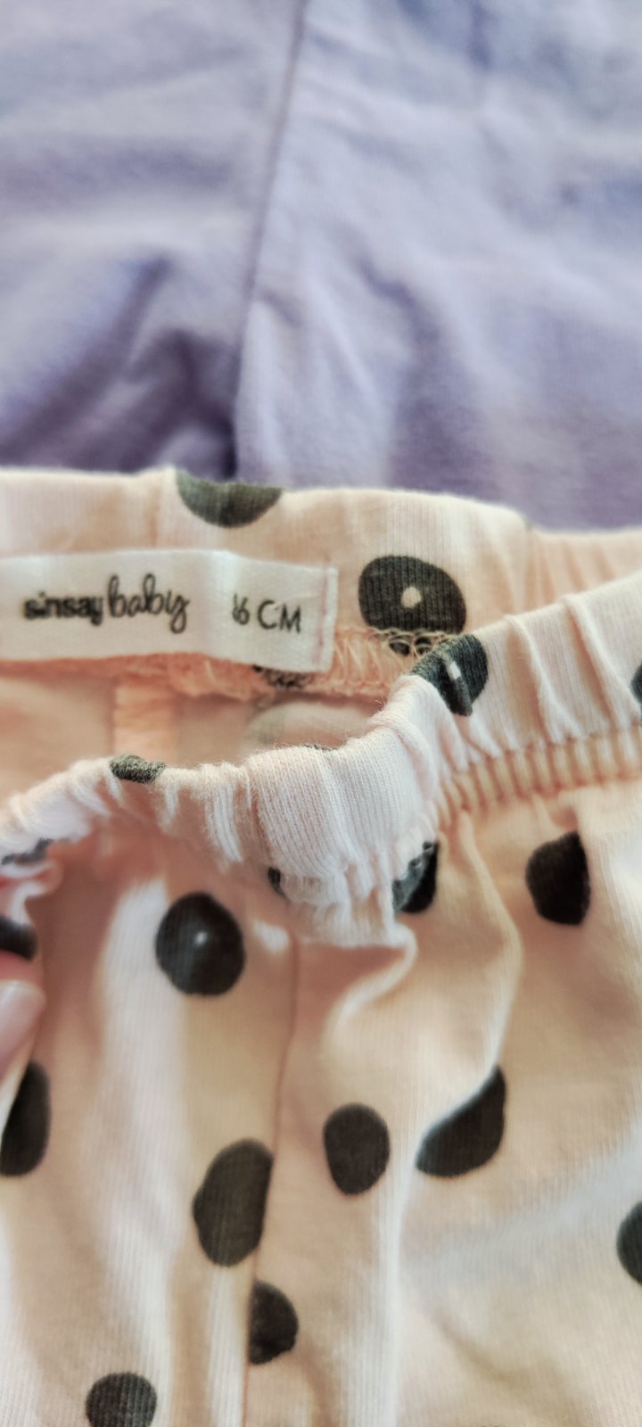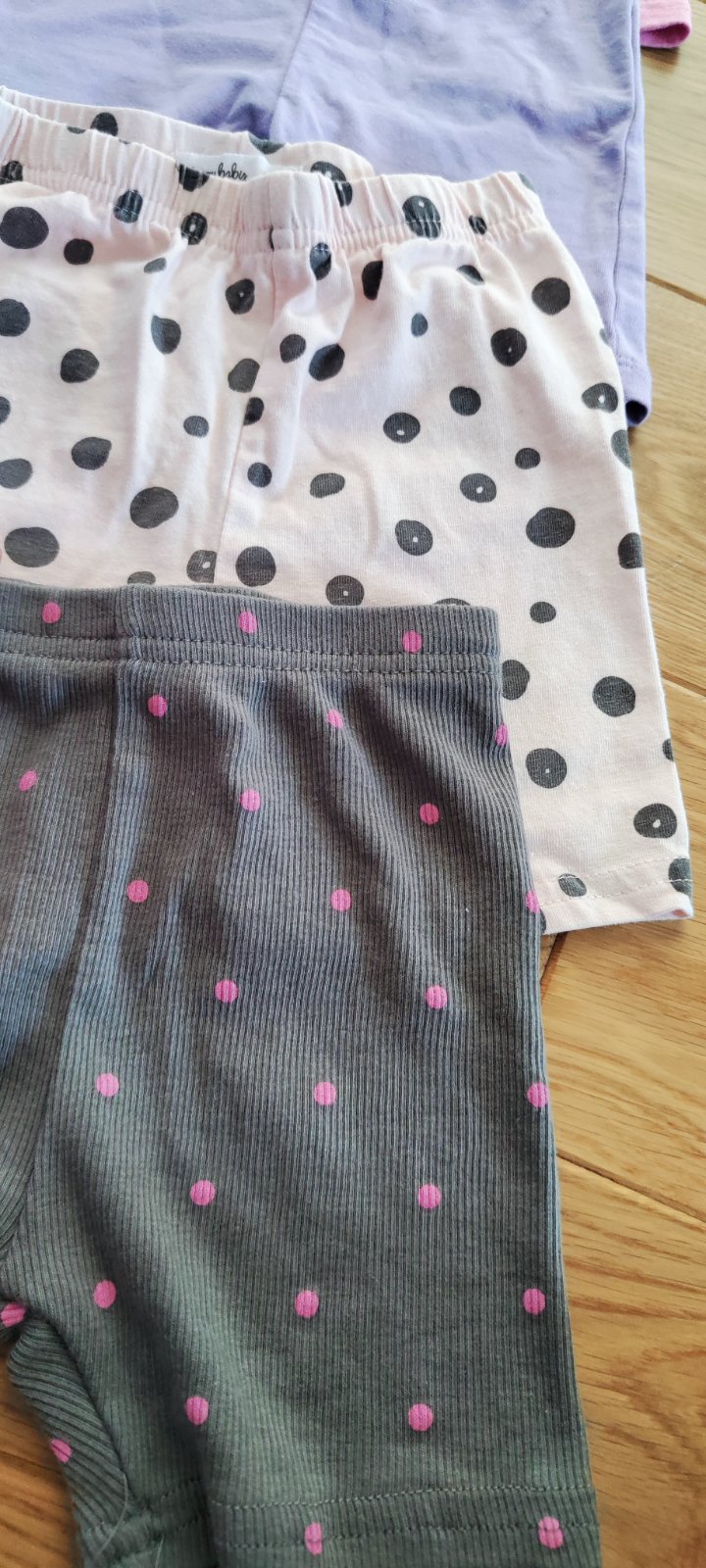 Ponúkam na predaj dievčenské legíny (2 ks - tmavo fialové s bielymi bodkami a tmavo sivé s čiernymi srdiečkami) a bledo ružové body s krátkym rukávom s farebnými srdiečkami. Všetko značka H&M, veľk...