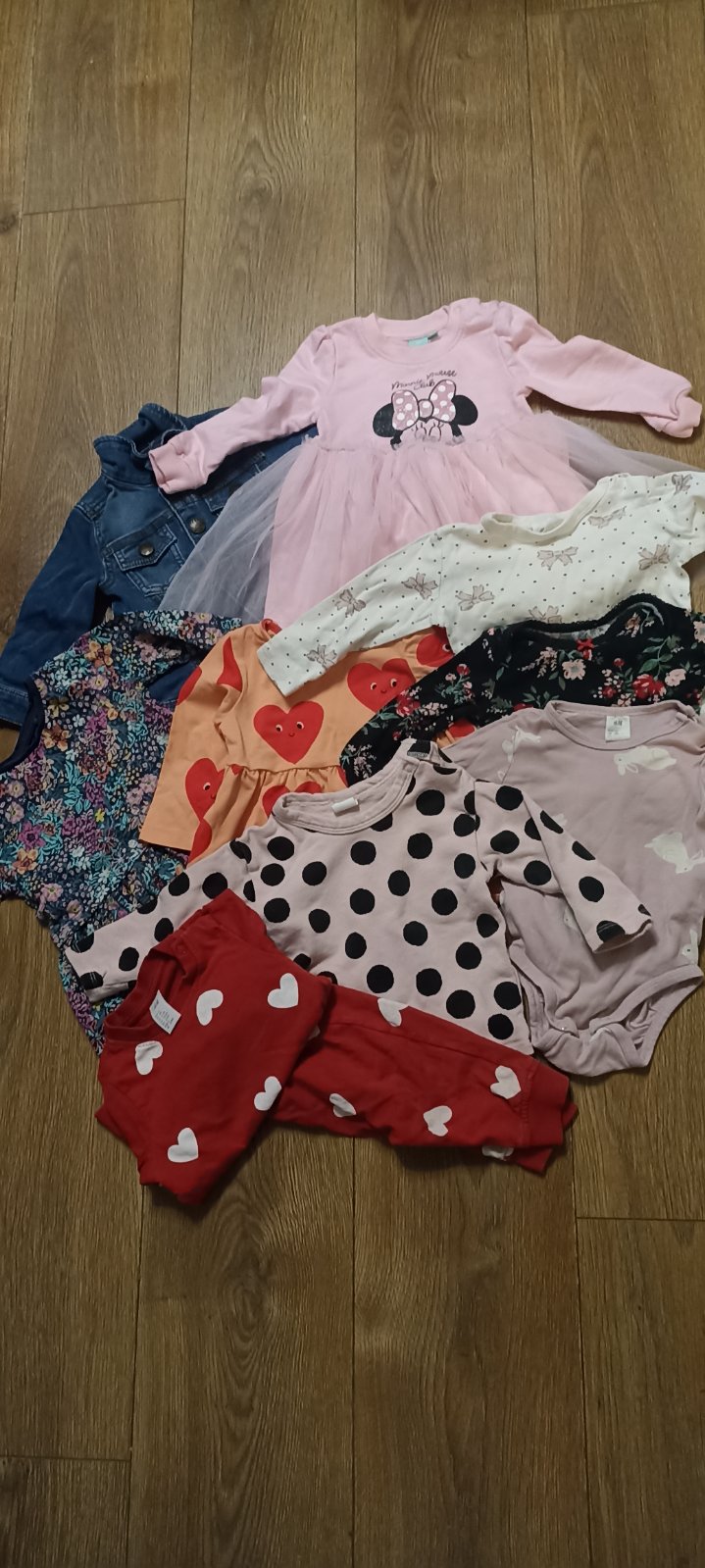 Balík veci v peknom stave. Šaty so srdiečkami Lindex, tunika modrá s kvietkami Next, body H&M. Tepláková súprava so srdiečkami a bodkovane tričko H&M. Body H&M a Carters. Riflová bunda F&F. Šaty Disney.
