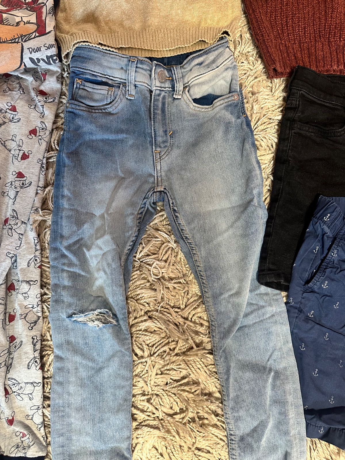 • Rifle H&M – výborný stav, štýlová diera na kolene,ale asi tak kúpené neboli, nastaviteľný pás