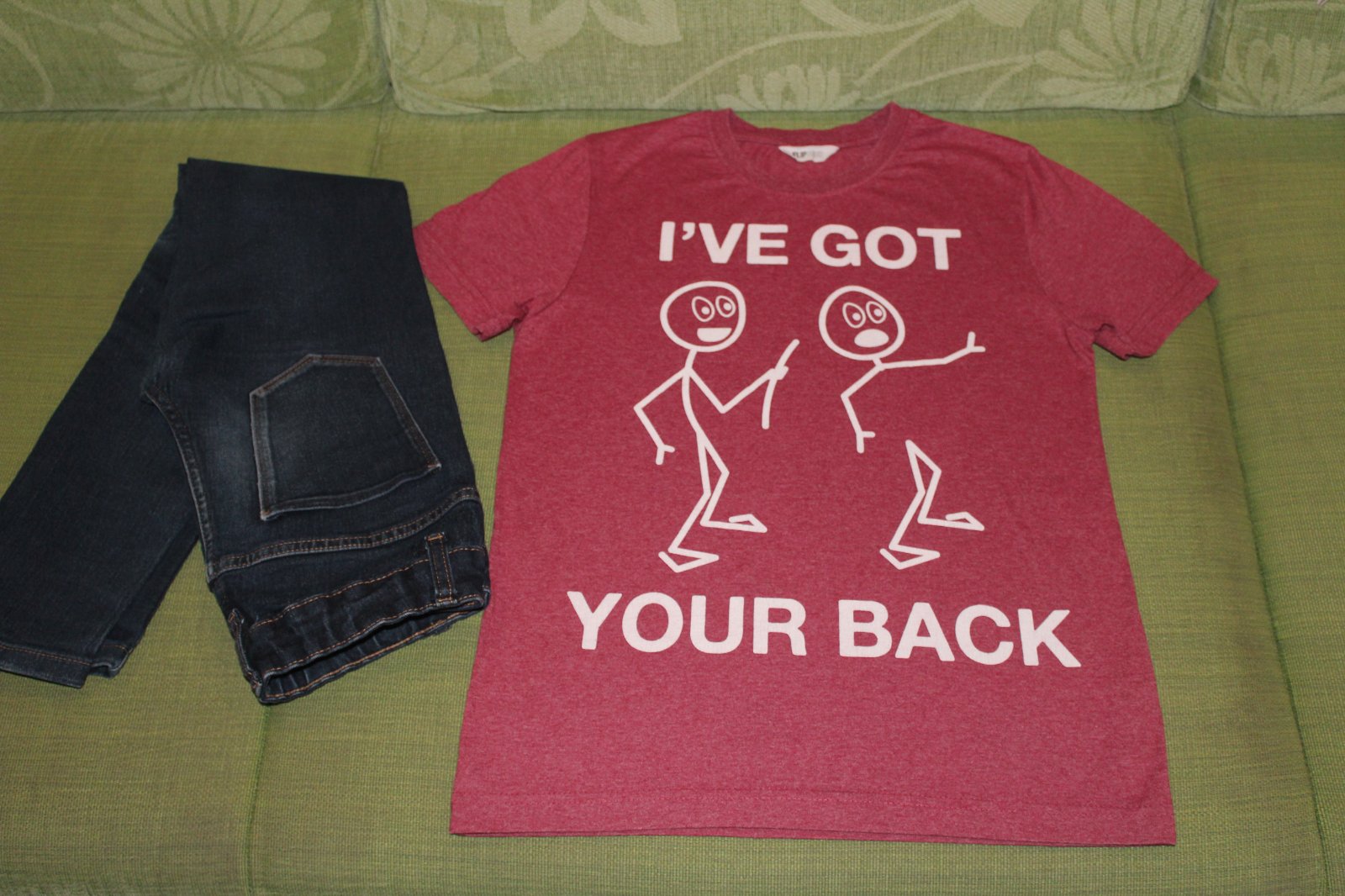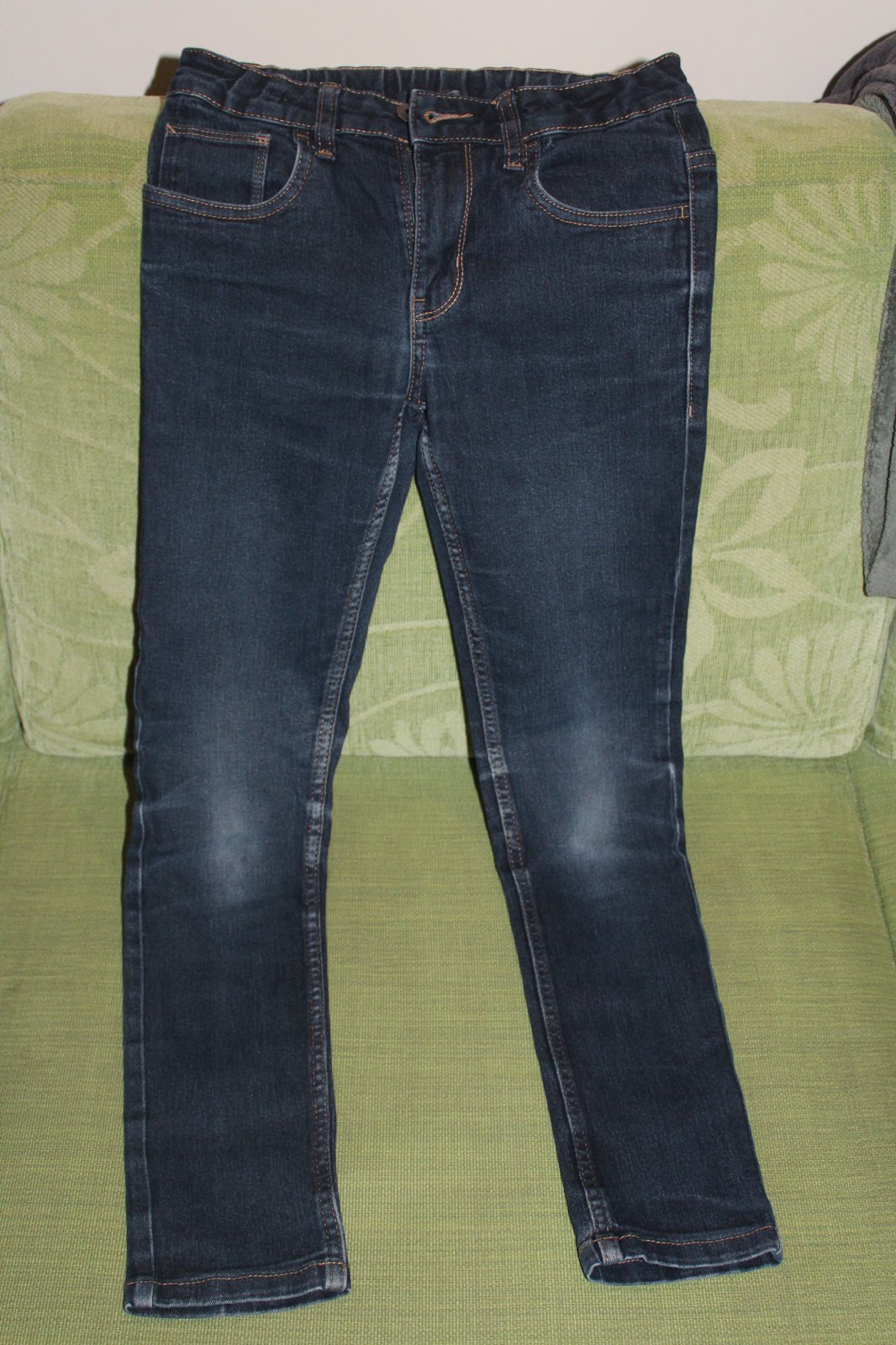 Vo veľmi dobrom stave. Tričko nosené menej, na rifliach nosenie vidno len na kolenách.