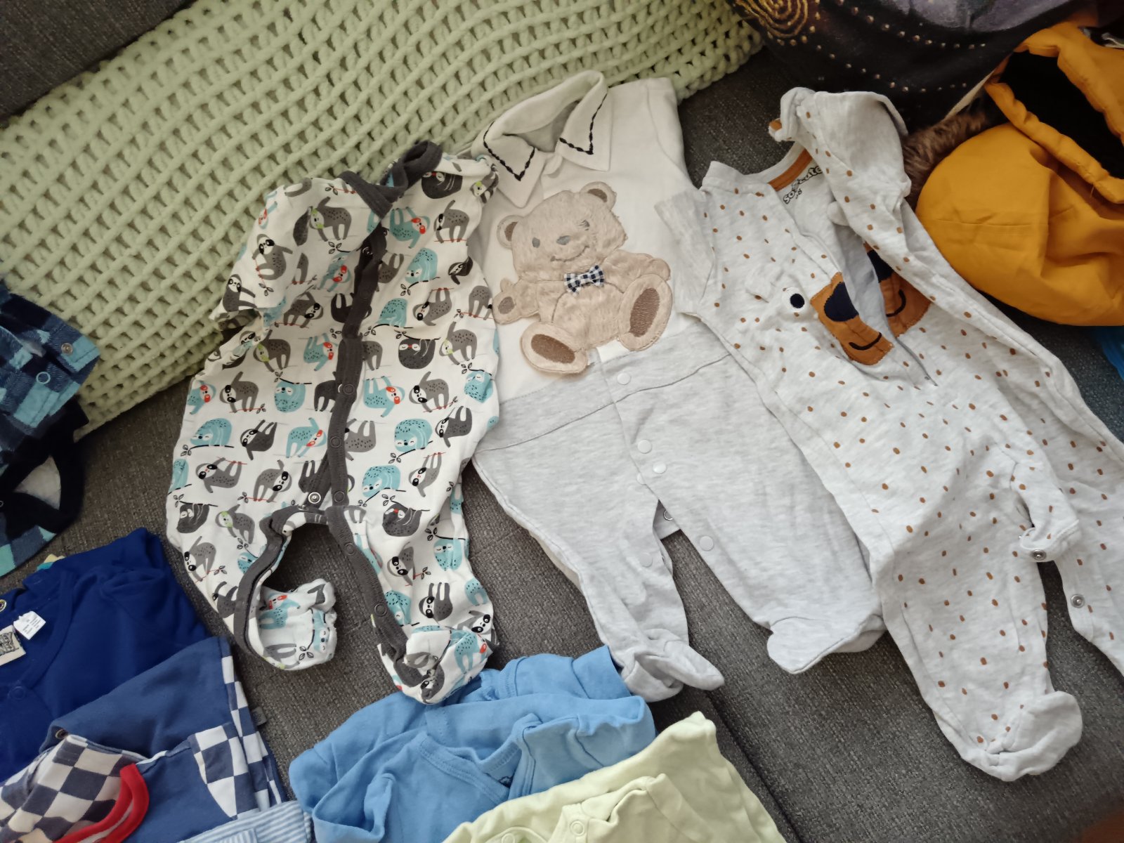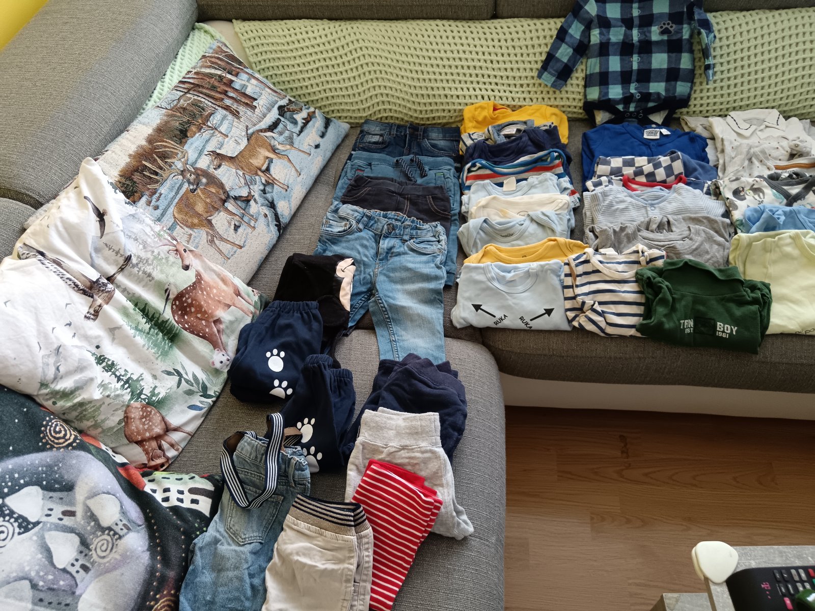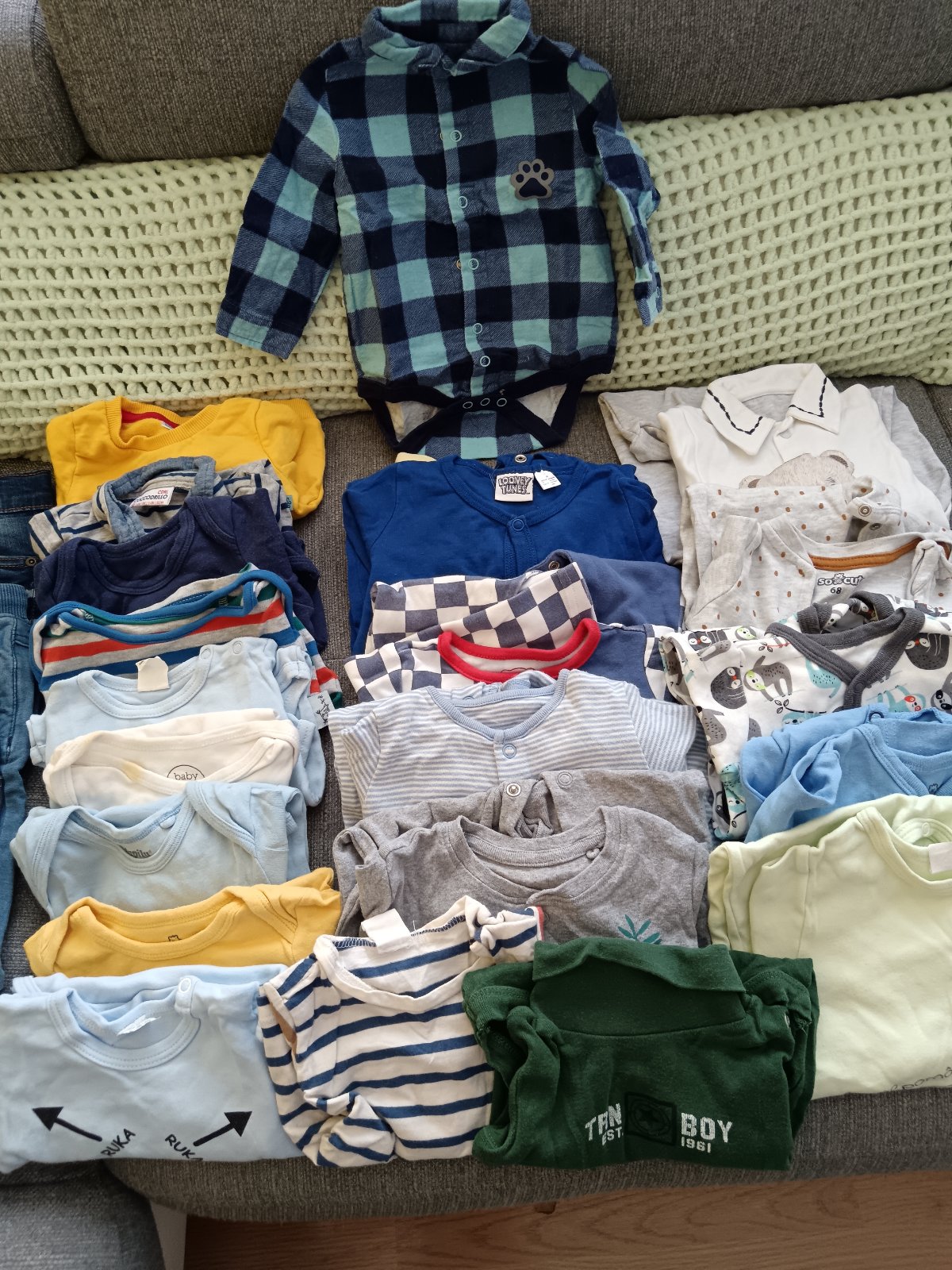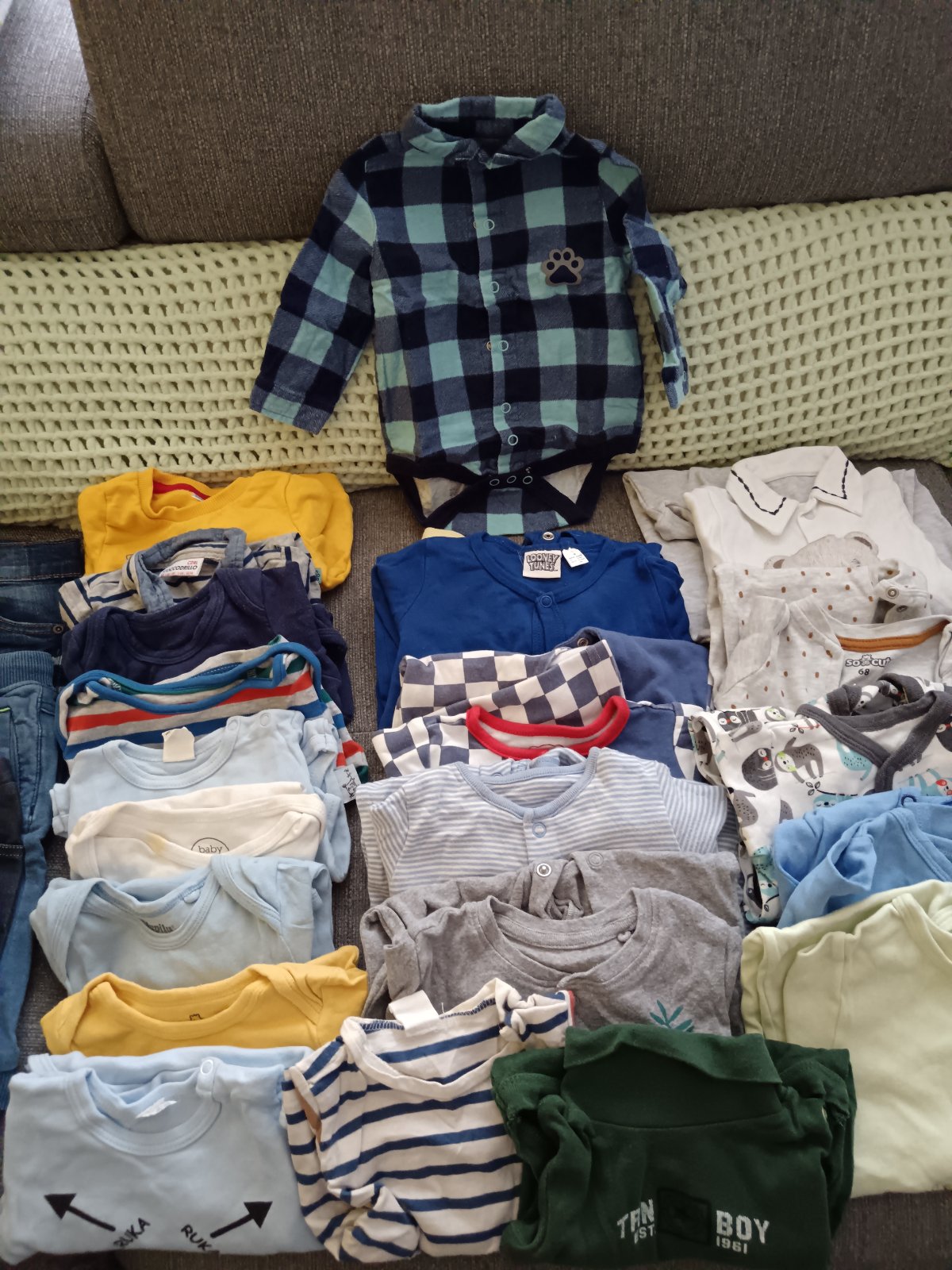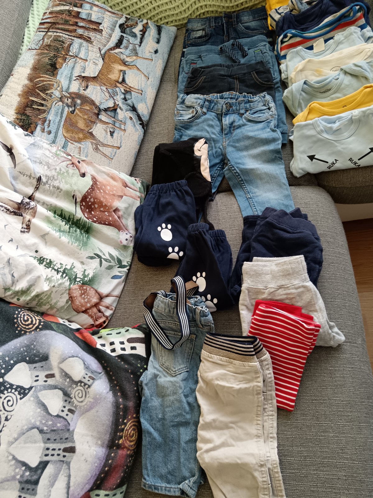 Balík oblečenia pre chlapca veľkosť 68-74,rifle,nohavice 7ks, tepláky 5ks, body dlhý rukáv 12ks, pyžamo ruka noha 9ks. Všetko spolu cena 20eur