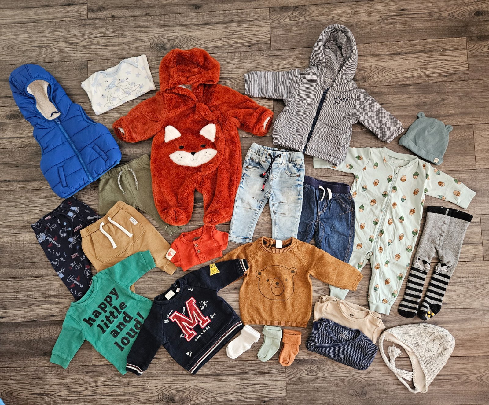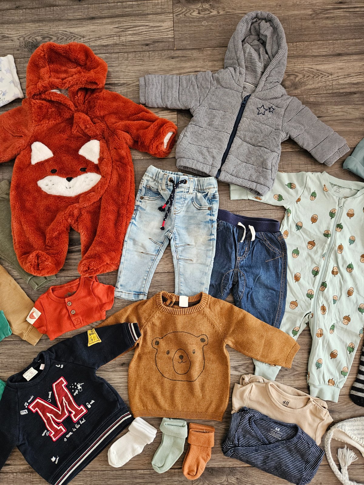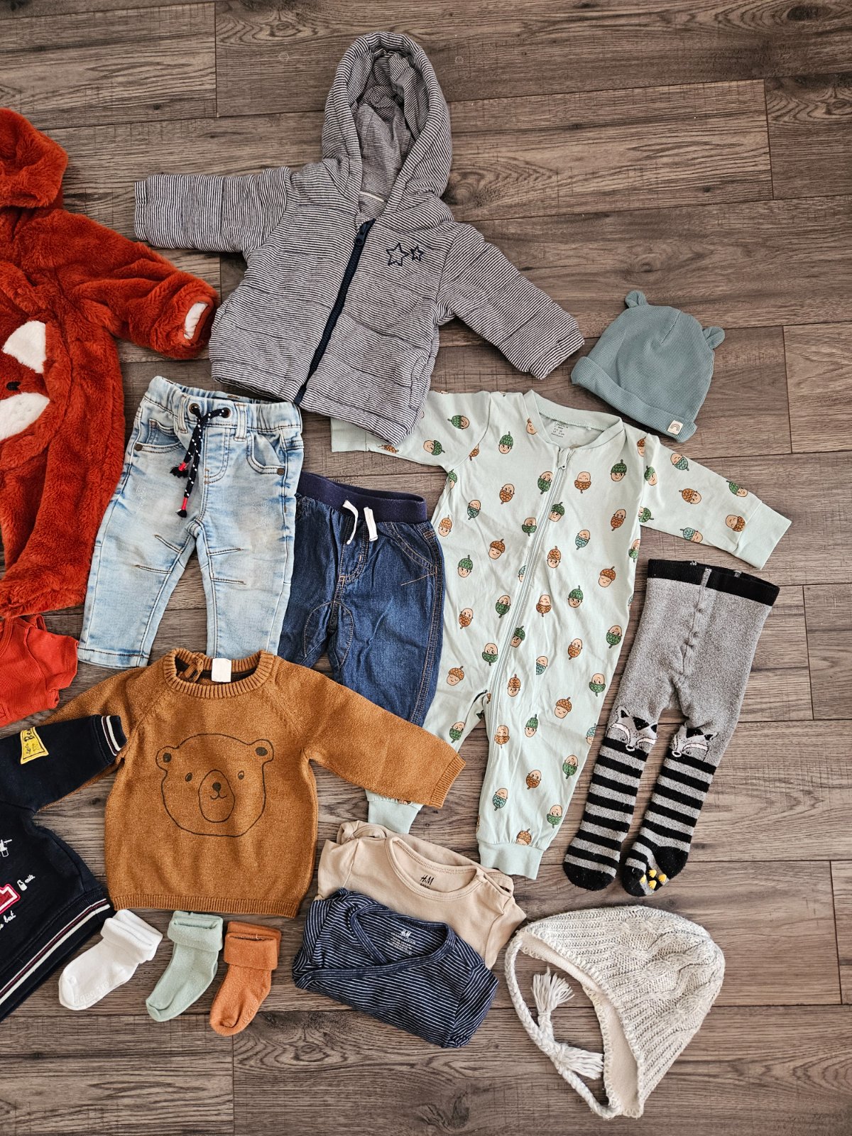 ● H&M- hnedé tepláčiky, hnedý svetrík s mackom, tmavomodré pásikové zavinovacie body a hnedé body, sivá pletená čiapka