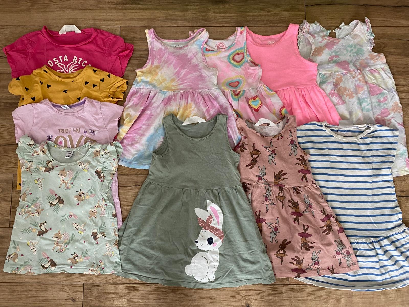 Letne oblecenie v.98-104, znacky - 3x saty H&M, 3x saty F&F, tunika next, tricka - 2x dopodopo, 1x H&M a 1x sinsay.