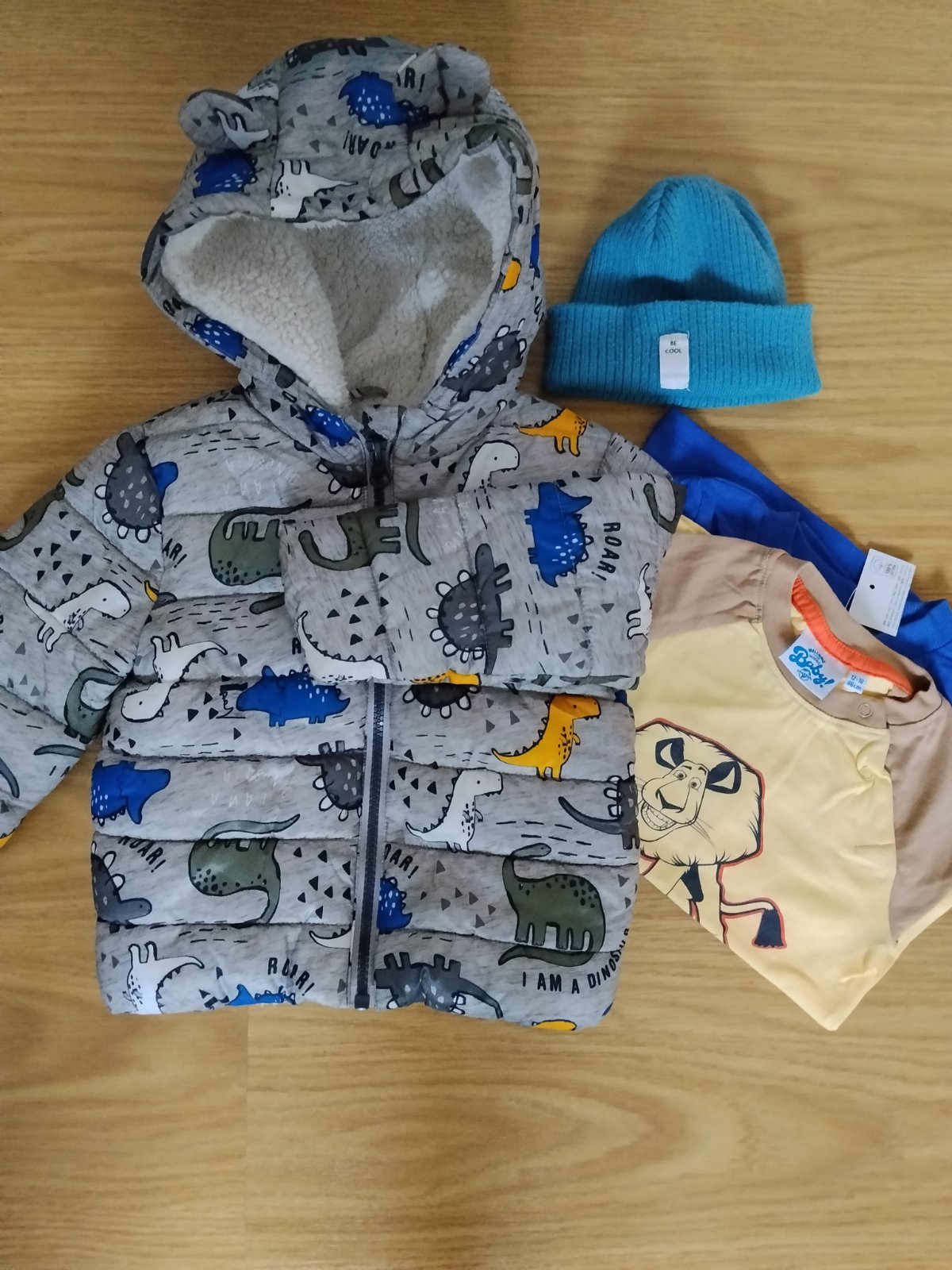 Veľkosť 86. Bunda má jedinú chybičku krásy (zatiahnutie, nie je to ani vidieť, viď foto). Tričká s dlhým rukávom sú nové. Cena spolu 3,50€.
