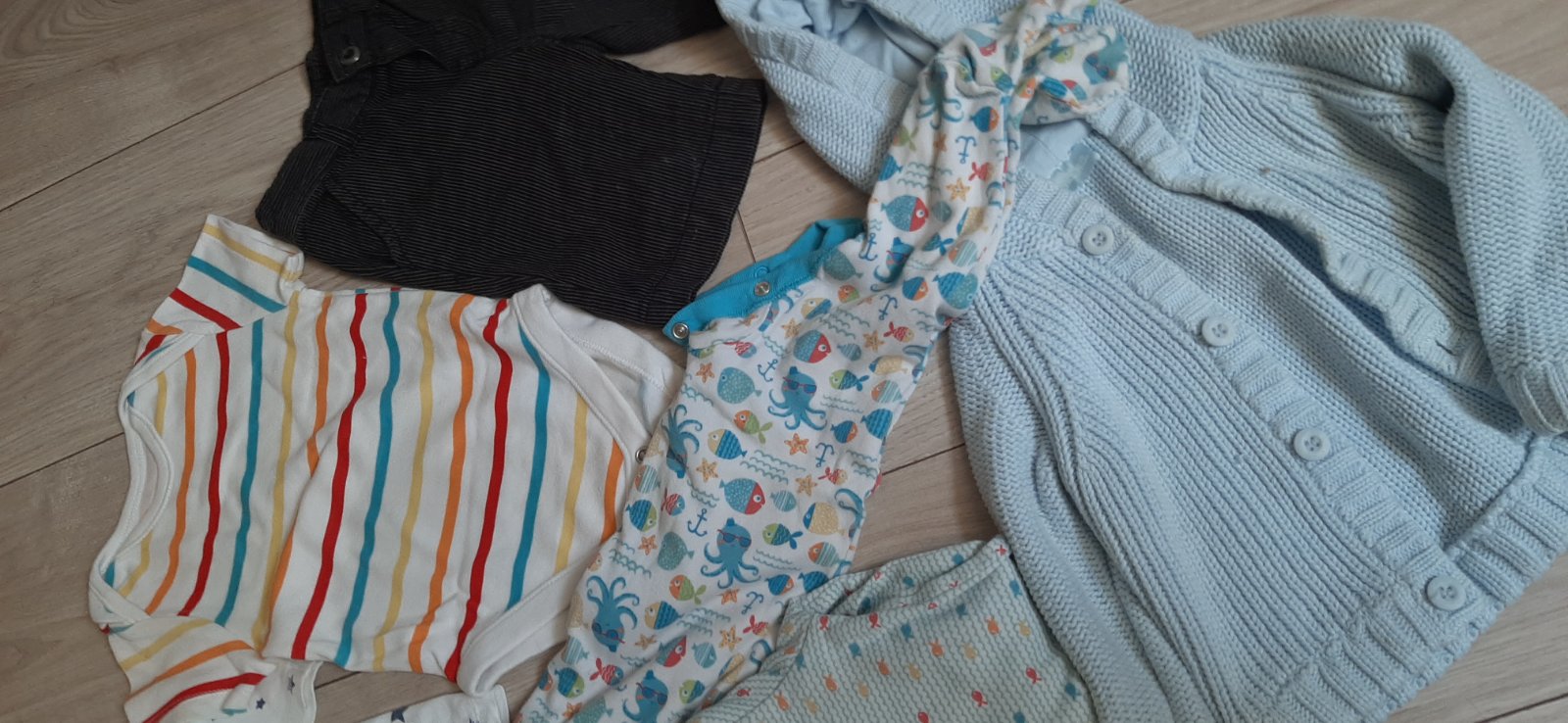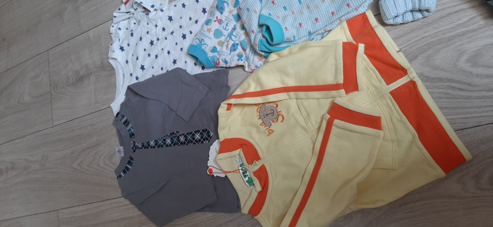 Veľkosť oblečenia je 74cm. Balík obsahuje: 2x kratasy 2x súprava krátke tričko a teplaky 1x súprava kratasy a tricko 2x body s krátkym rukavom Bez poškodení, cena 10€+pošta