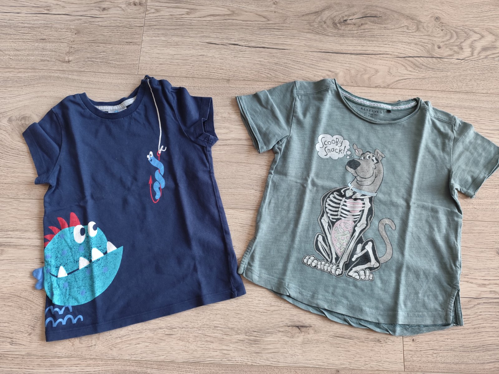 4. Tmavomodré s rybou nosené viac, trochu vidieť na aplikácii, inak pekný stav, píše veľ. 98, ale nosené v rovnakom čase.