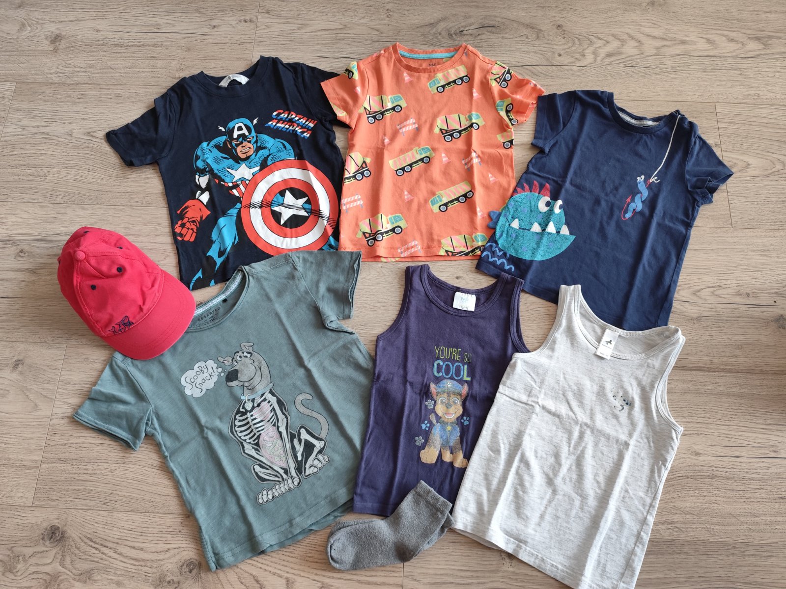 Balík obsahuje tričká s krátkym rukávom, tielka nosené - vidieť na aplikáciách, ale inak bez poškodenia, ponožky pridávam grátis, šiltovka nosenia, veľkosť píše 3-6rokov, ale ideálne 3-5rokov Max.