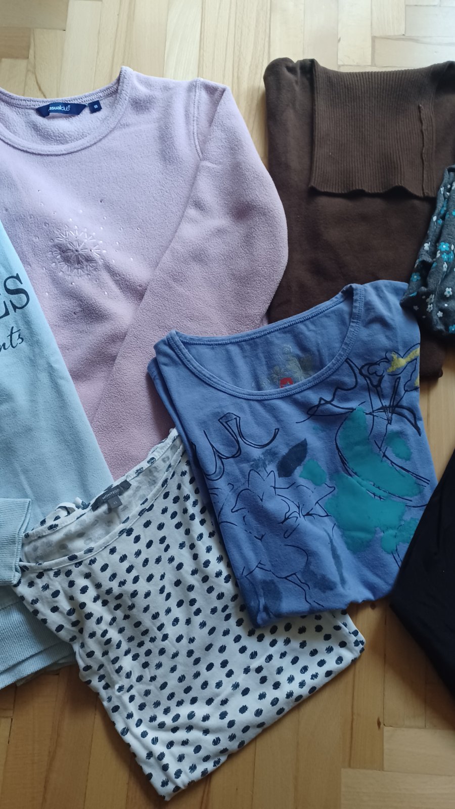 Posuniem za poštovné nenáročnej mamine alebo slečne na donosenie balík oblečenia. Veci sú čisté, bez dier, sem-tam žmolky. Balík obsahuje: modrá mikina S (má pár fliačikov), ružová fleesová mikina, hnedý rolák S, 2 trická s krátkym rukávom, kvetovaná tunika, čierne nohavice, veľ. 36 (super stav).