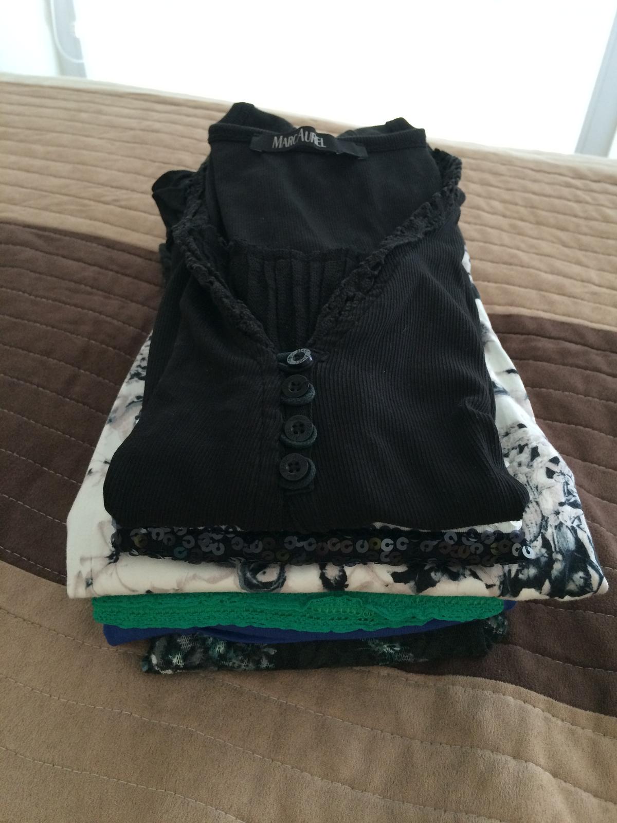Tielko čierne - Marc Aurel 38, tielko čierno biele - Lindex S, Blúzka bez rukákov, po bokoch čierna - Orsay 36, zelené tričko - Lindex S, modré tričko - Orsay S, predĺžená tunika s kvietkami - Orsay S... Kus po 2 eurá, pri odbere všetkých dohoda možná...