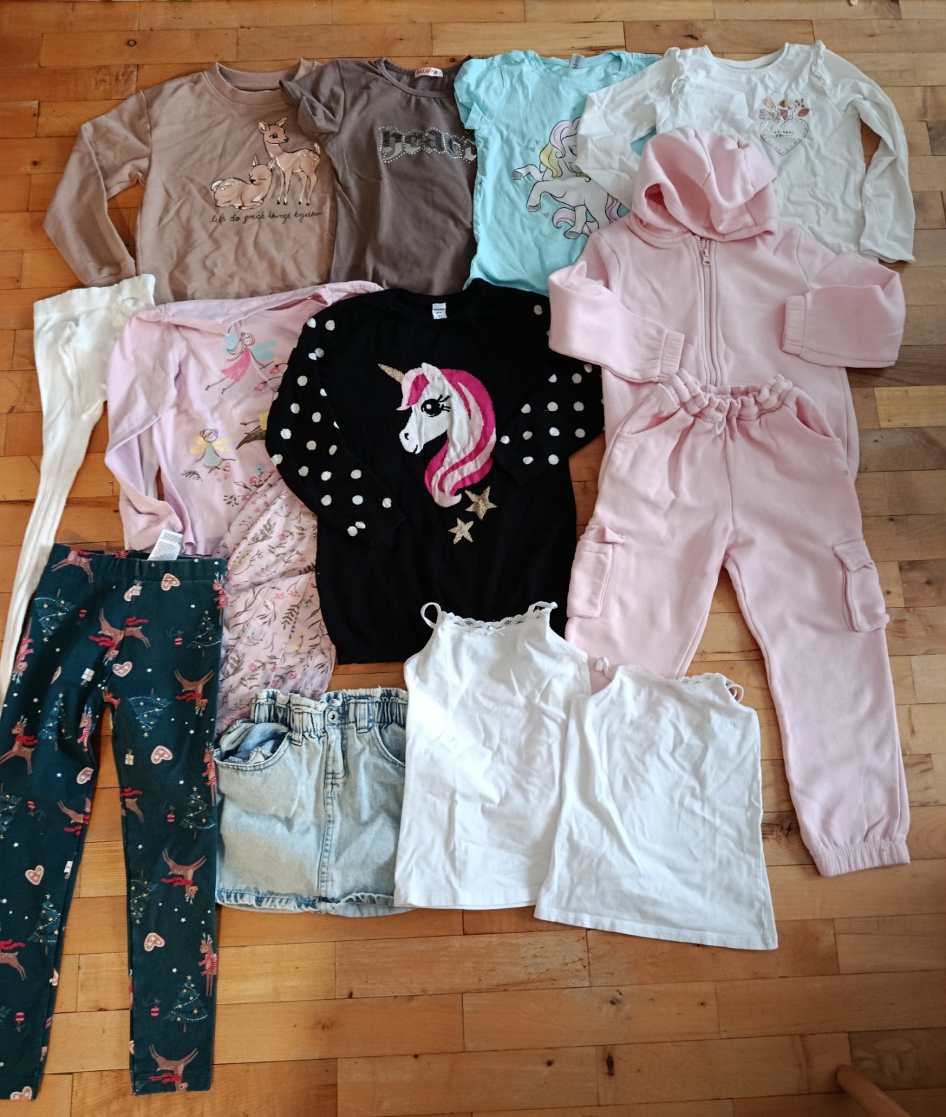 Dvoje naľavo F&F 7-8 r Ružové kúpili , písané 110/116,ale v pohode 122 Modré Shein 122 Cena za všetky