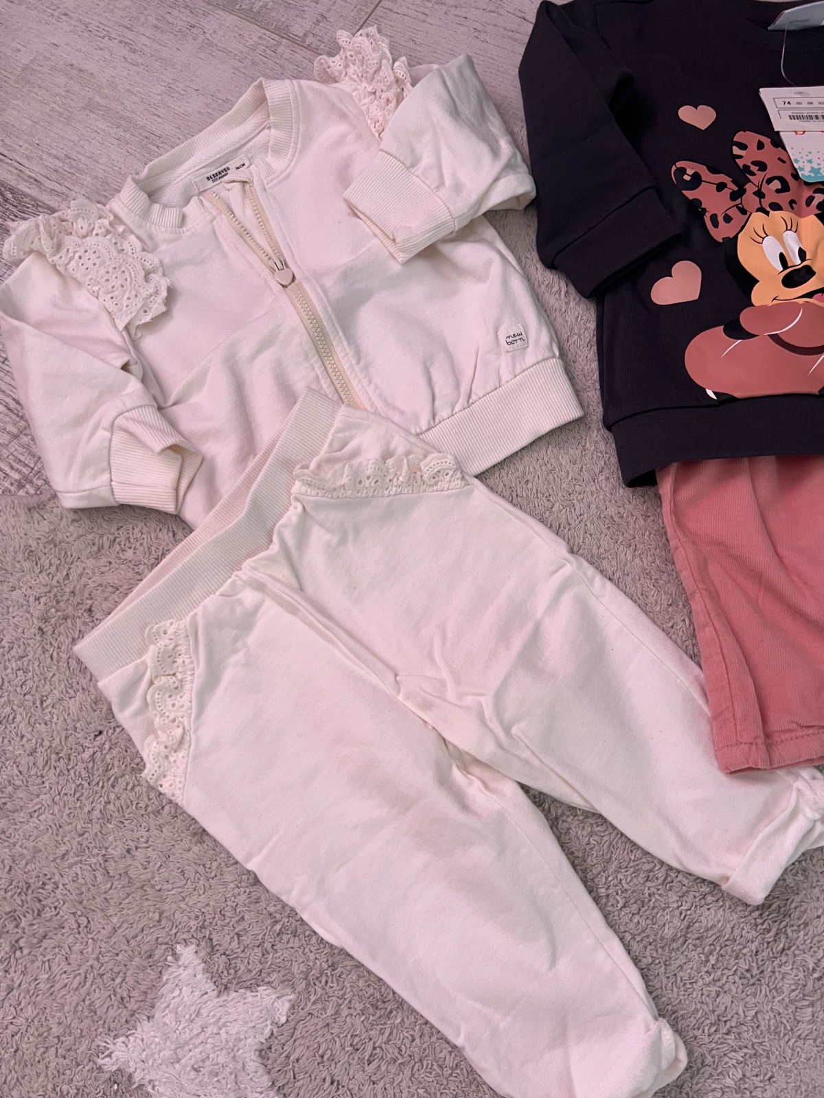 Ponúkam na predaj balík oblečenia vo veľkosti 74. Biela súprava nemá už vysiacku ale je nová len oprata … ďalšie majú vysiacky …. Vhodne ako darček