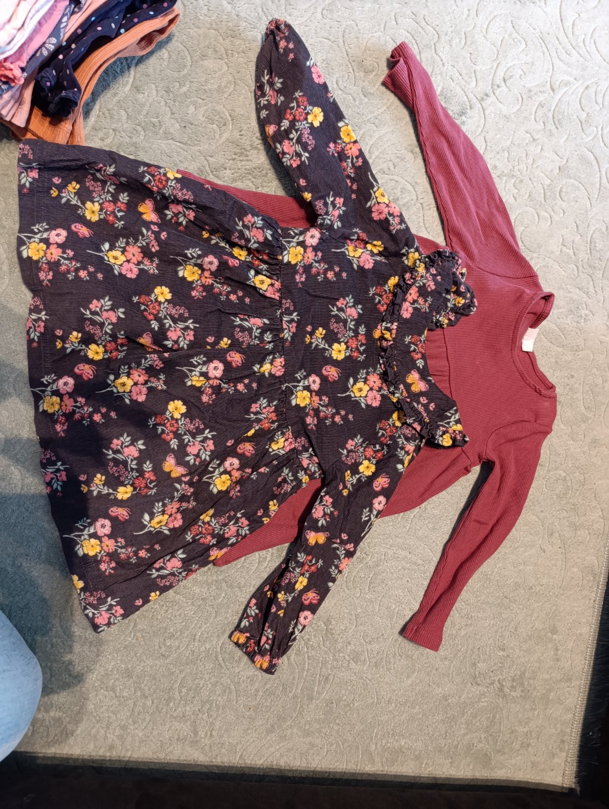 Krasne svetriky a nohavice v top stave. Bugs Bunny leginy gratis. Farby na fotkach trochu skresluju. Staroruzova farba svetrik a tmavo bordove mierne elasticke mencestraky ( nie velmi hrube). Pasik...