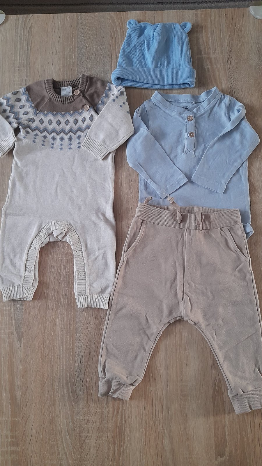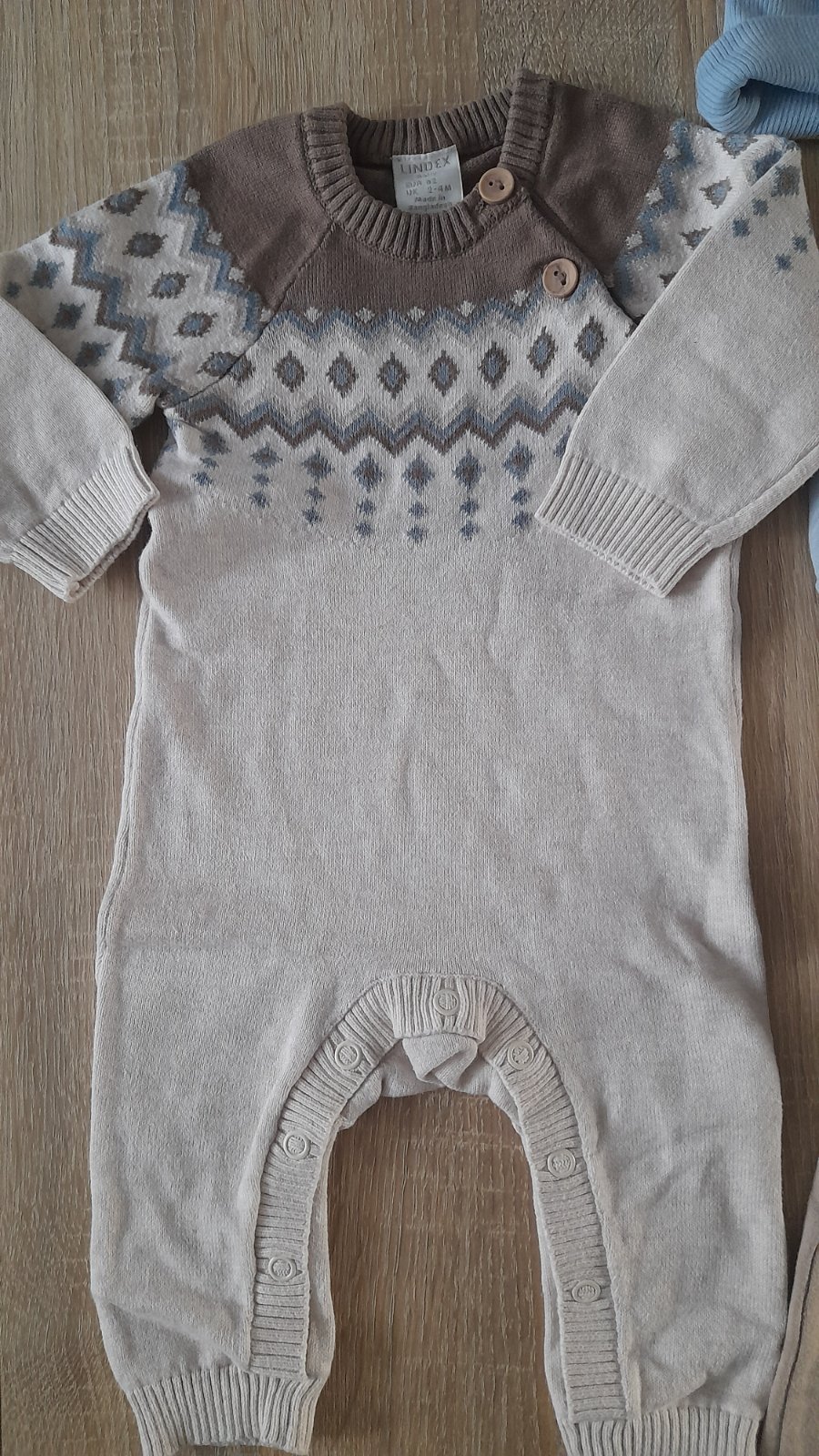 Veľmi dobrý stav, iba tepláčky majú žmolky. Svetríkový overal 62, body nerastúce 68, tepláčky 74, čiapočka 40/42
