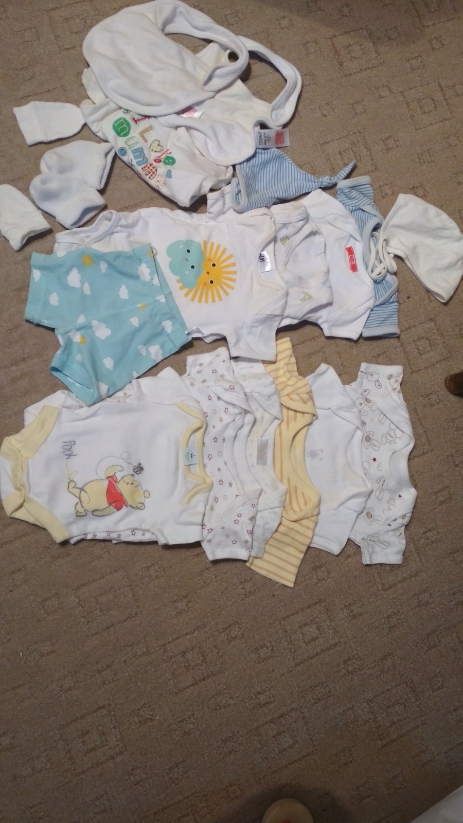 Balík farebne neutrálneho oblečenia pre najmenších. U nás používané pre bábiku, ale je to klasické bábätkovské oblečenie rôznych značiek.