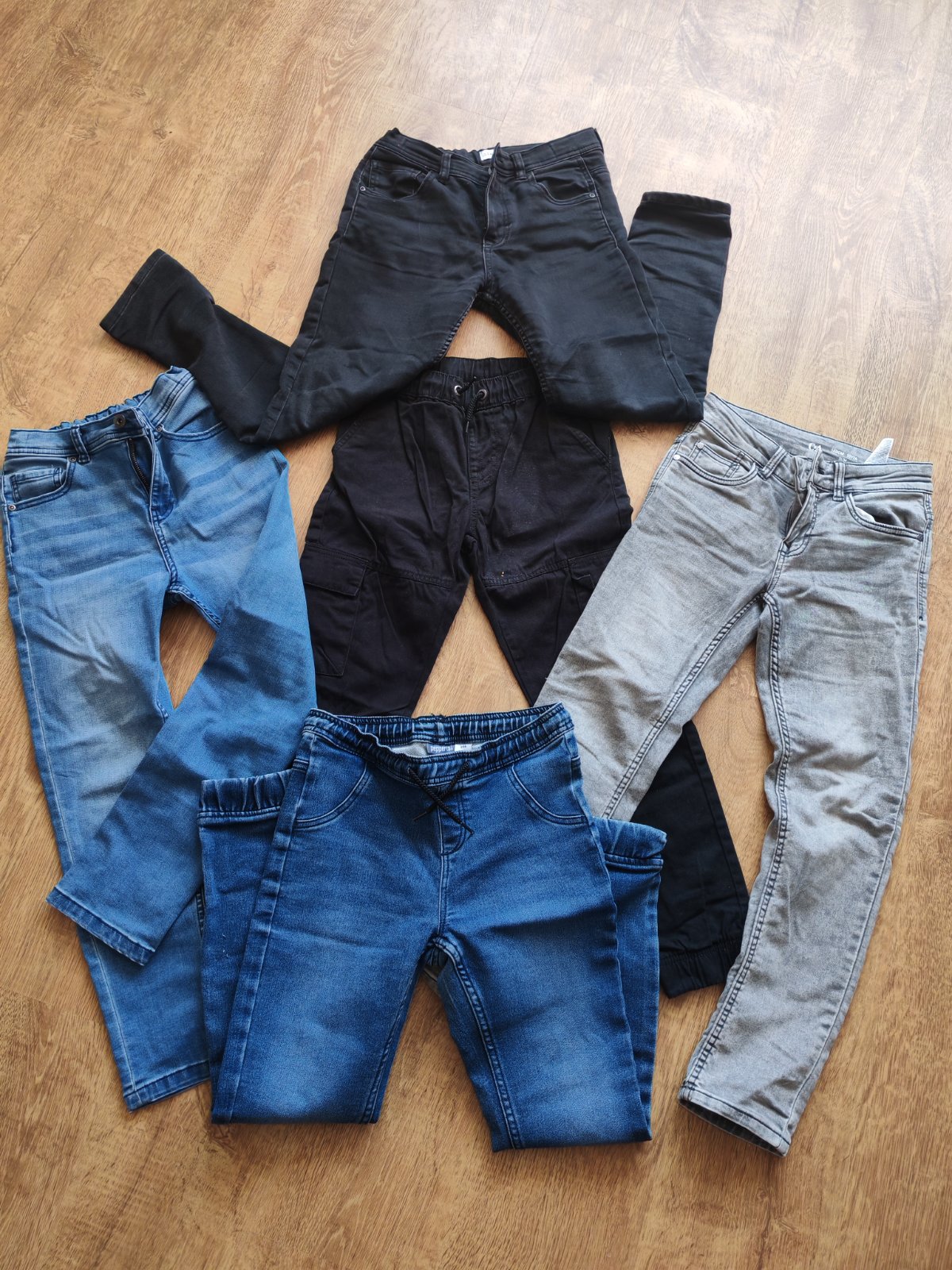 Veľkosť 140, balik obsahuje 2 x modre rifle v pase nastaviteľné, 1x čierne rifle v pase nastaviteľné, 1x sive rifle v páse nastaviteľné, 1x cierne kapsacove nohavice v pase na gumku a šnúrku. Cena za kus 7 e, spolu 30 e.