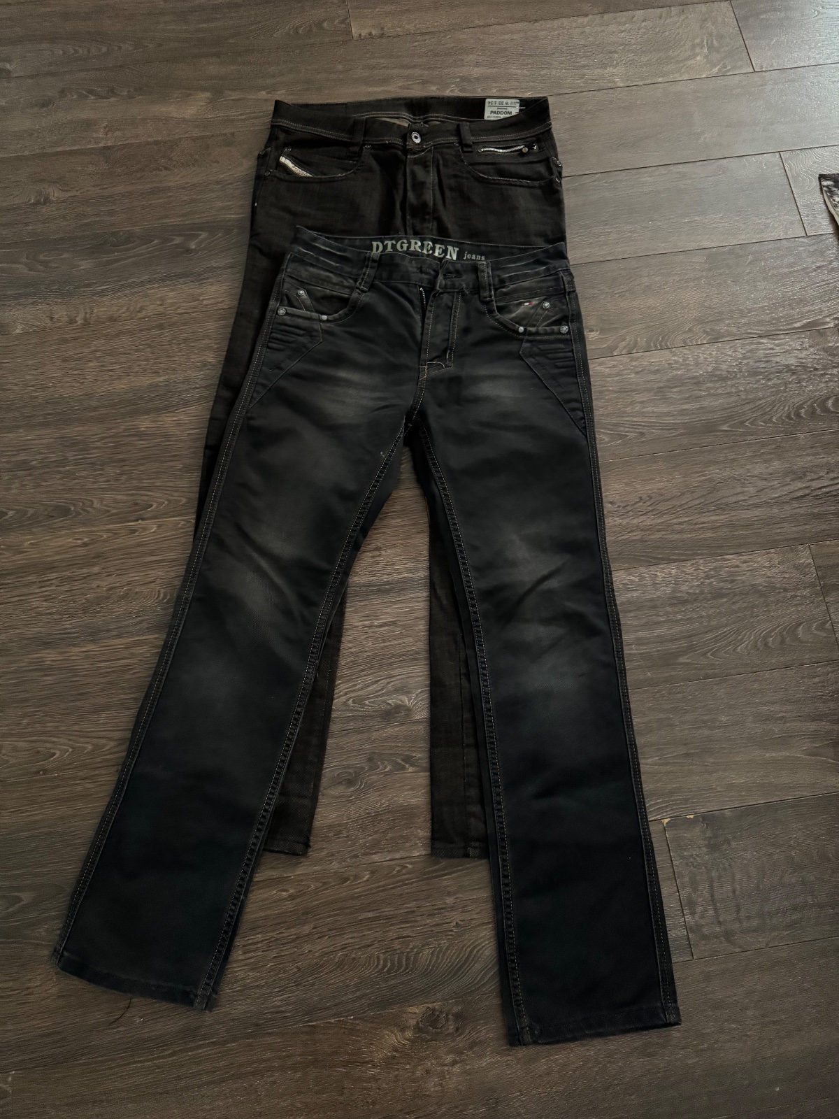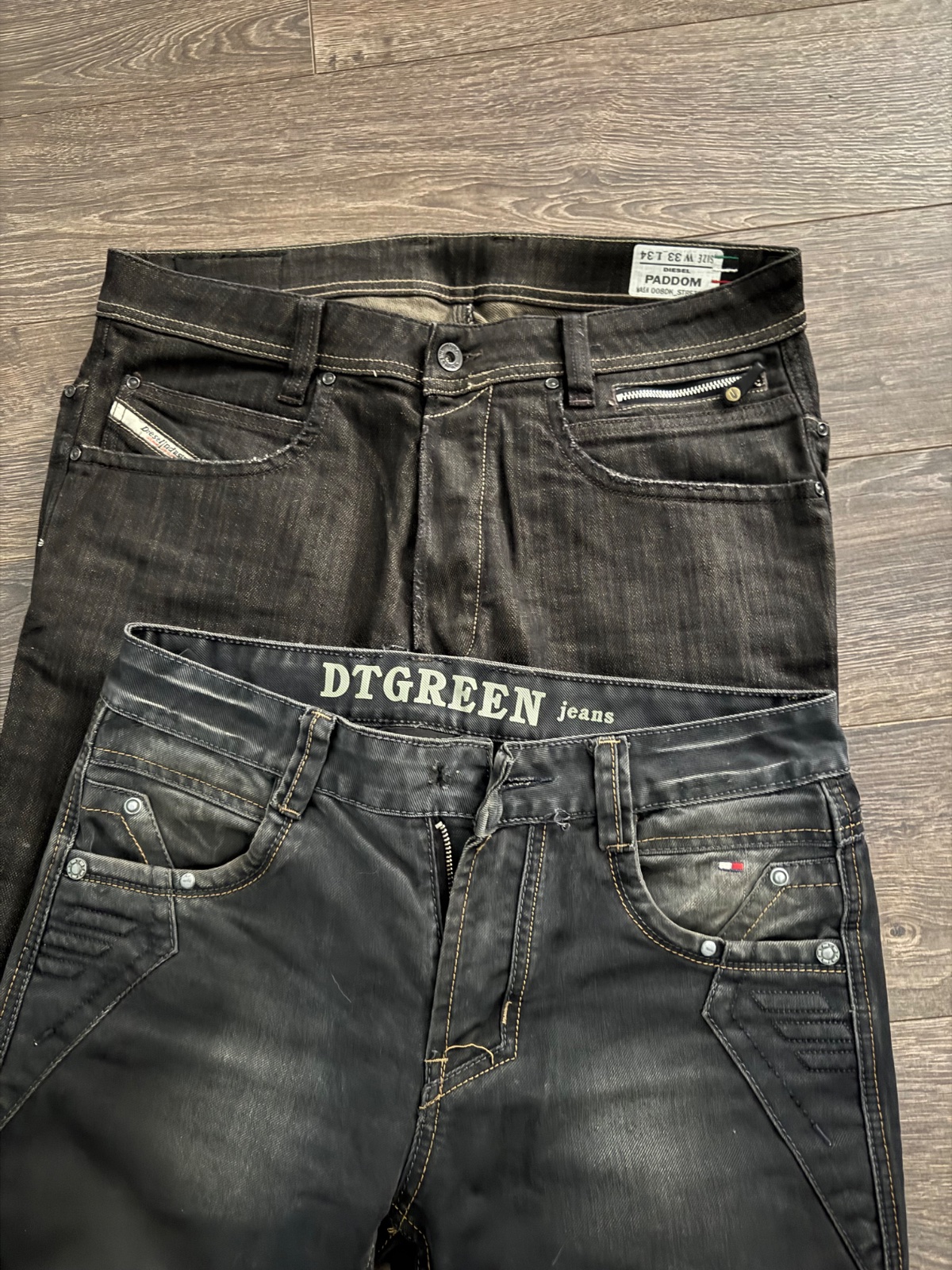 Svetlo modré moderné pánske rifle max tri krát oblečené sú bez poškodení. Veľkosť tak 50 pás je 85cm a dlzka 103cm predny pas je cca 2cm nizsie. Tmavo modré tak tieź ako nové bez chýb.Veľkosť 32/4...