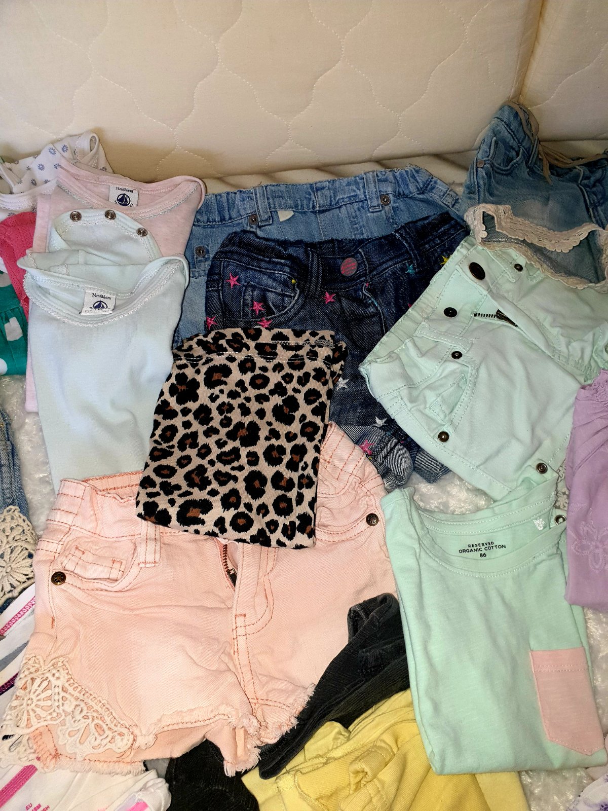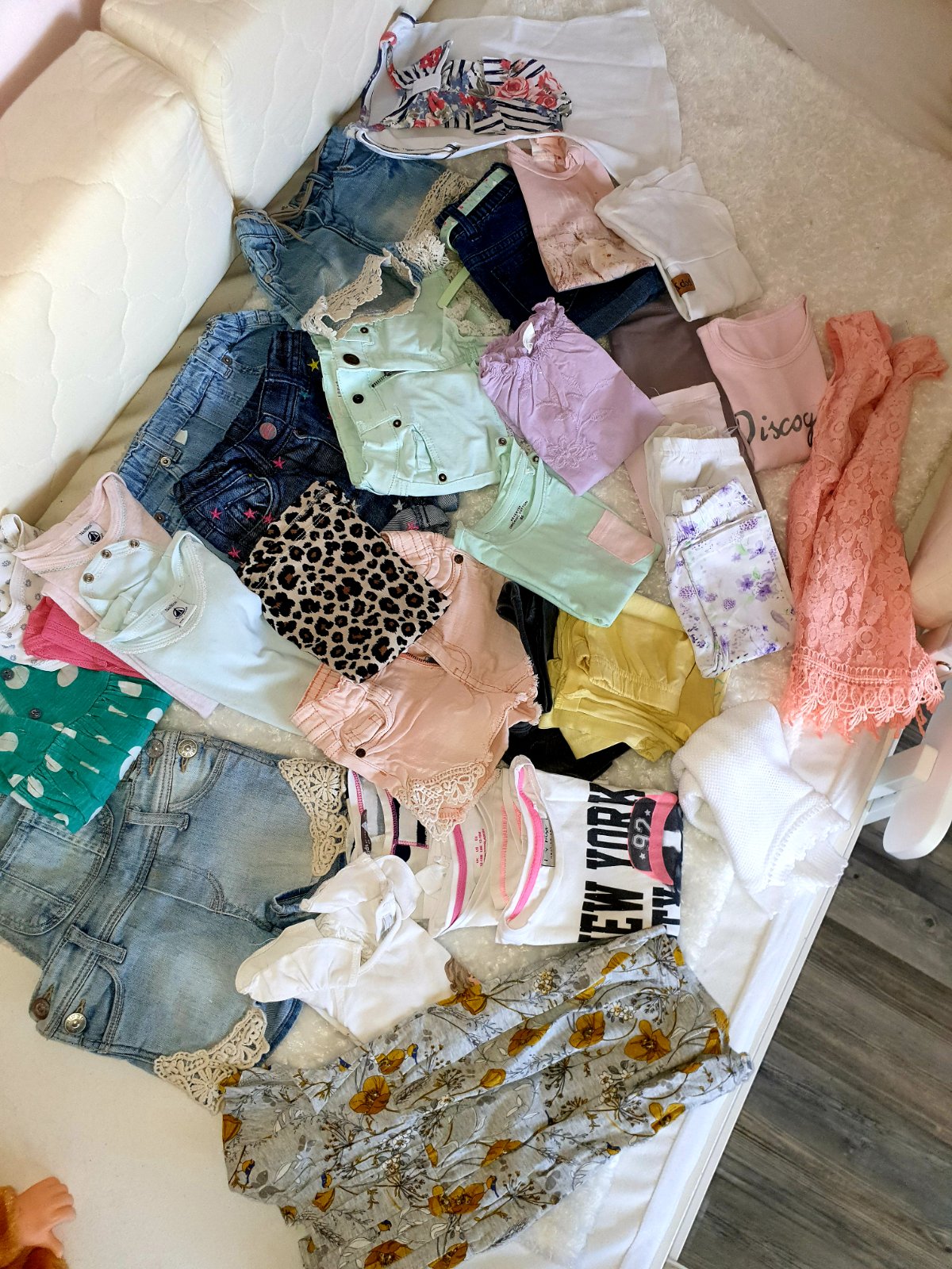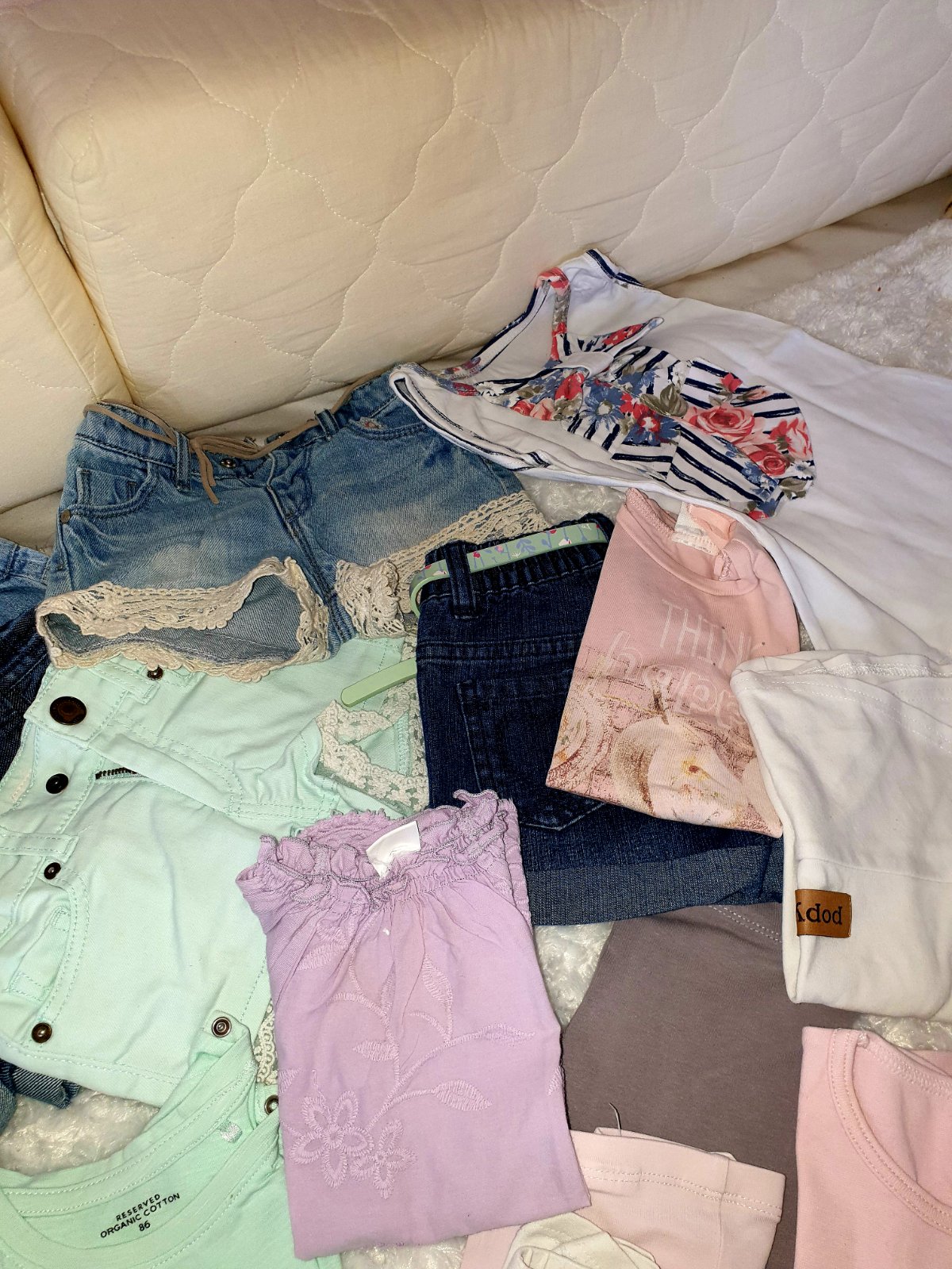 Predam balik styloveho oblecenia pre dievcatko znacky Next,H&M,lindex,reserved,Mayoral,Petit Bateau...Balik obsahuje 3 x saty, 6 x riflove kratase, 1x kratase na traky, 3 3/4 leginy,1 dlhe, 4x body s kratkym,svetrik s dlhym rukavom,tielockove saty s maslickami,11 x tricko s kratkym..predavam len spolu,niektore veci ako nove,ine nosene,je aj vidiet (tie skor myslene ako gratis,cena je za pekne veci,pc bola ovela vyssia), my sme nosili tak,ked malinka mala cca 2 roky, cisla su od 74-80 (kratase,lebo tie nam mensie pasovali) rozne do 86-92 (tricka s kratkym)...veci nepremeriavam,je to pre dievcatko cca 2 roky,sezona leto :), cena je fakt super