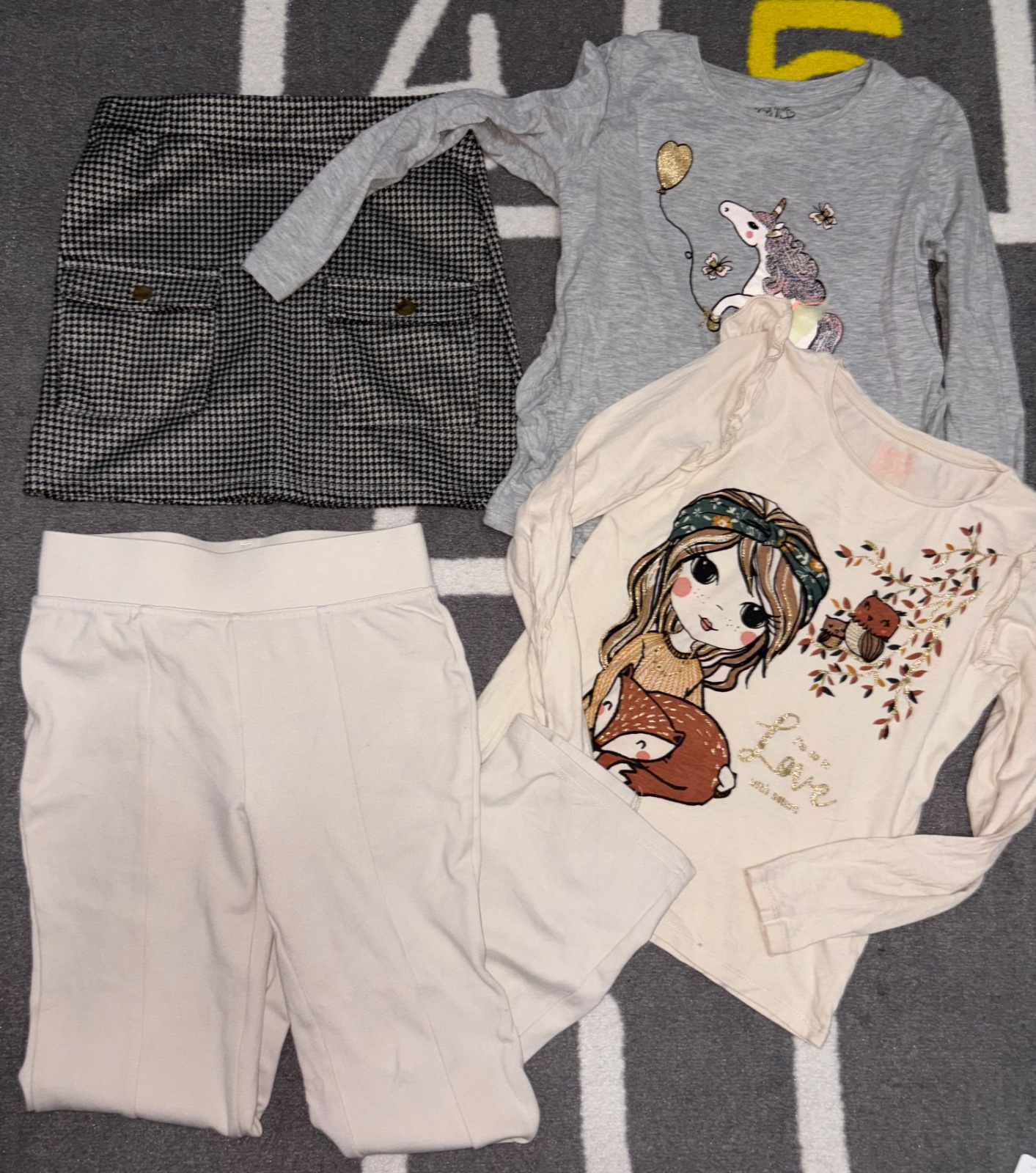 3x mikina,1x tepláky krémové, 3x legíny,2x tričko dlhý rukáv,1x sukňa