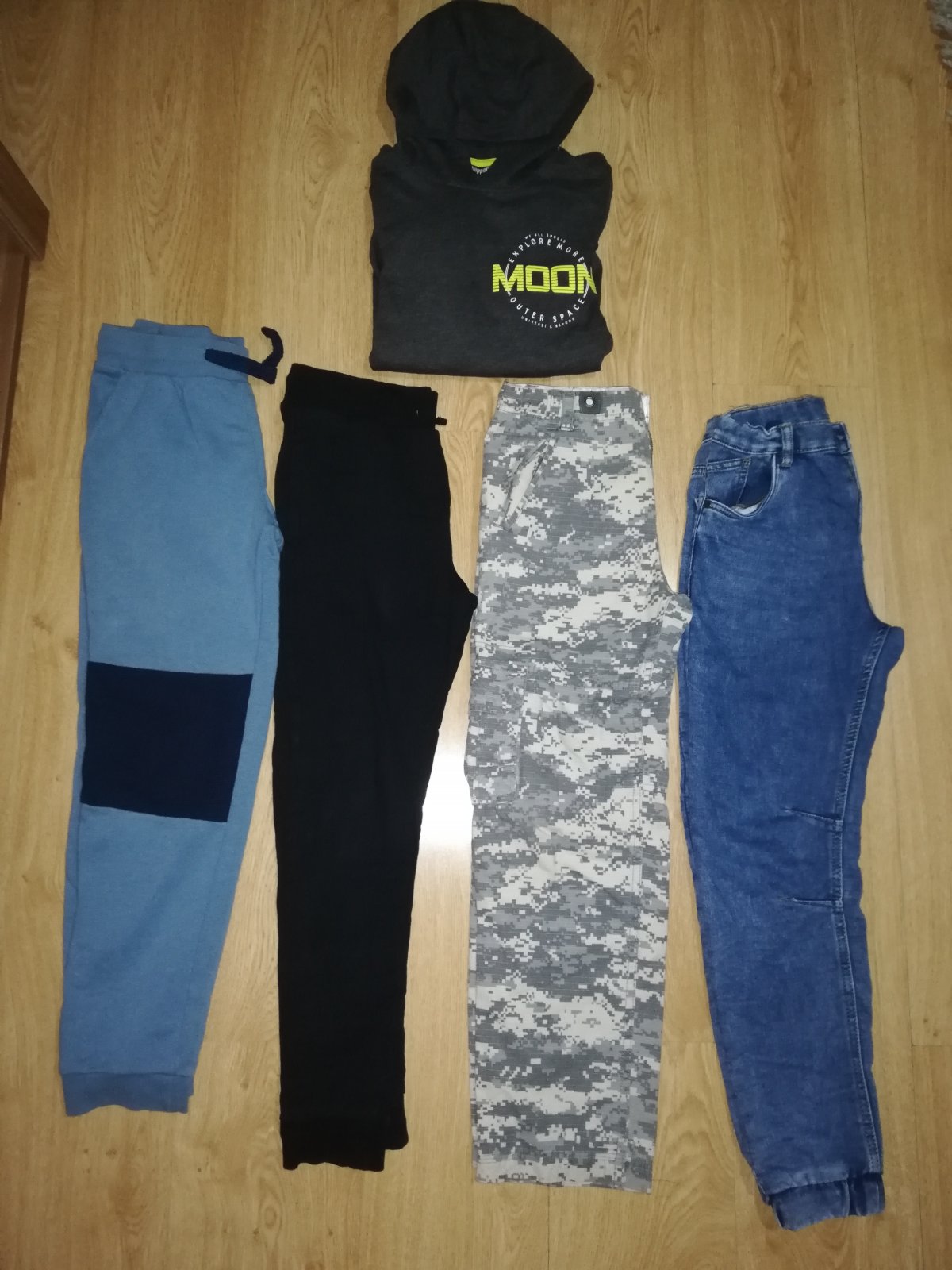 2kus teplákove nohavice, 1maskacove nohavice, a riflove nohavice, gratis pulóver s kapucňou.