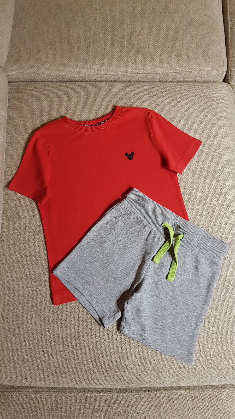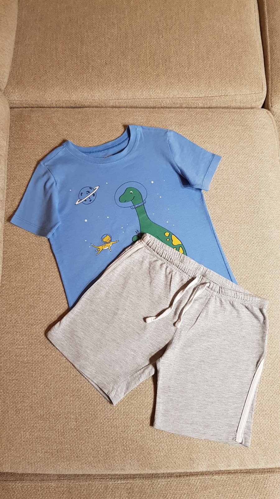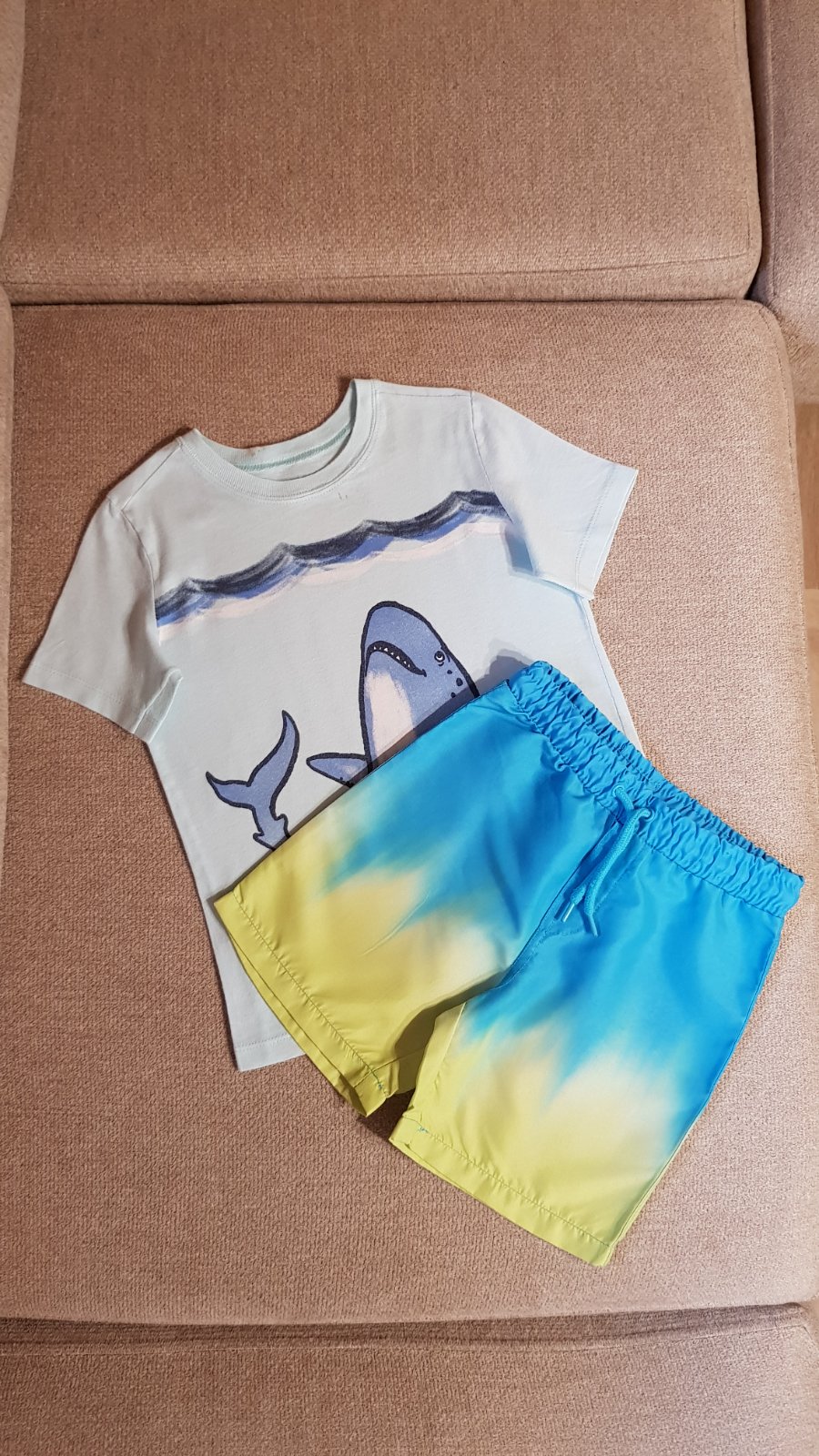 Balík letného oblečenia (23 ks - 12 tričiek a 11 kraťasov) pre chlapca, veľkosti písané rôzne (od 98-116), ale veľkostne to syn nosil od 104 do 116 (do minulej sezóny) naraz, teraz mu to je už tesné, a prikrátke (pre info má 6,5 roka a prechádzame na veľkosť 122-128). Prvých 5 "súprav" nosil do spoločnosti, takže sporadicky, sú vhodné stále medzi ľudí okrem krémového trička (tam mi práčka spravila dierky) a trička so žralokom (dva mini fliačiky pri krku, ktoré nejdú vyprať). Tričká sa dajú zameniť ale s inými - ďalšie 2 "súpravy" (s dinosaurom a červené mickey) boli nosené na výlety - sú bez chýb, vhodné takisto do spoločnosti. Zvyšné 4 "súpravy" a tričko boli nosené na doma - na donosenie. Do balíka aktuálne ešte pridávam súpravu Labková patrola - bez pošodení. Cena spolu 38 € + pošta.
