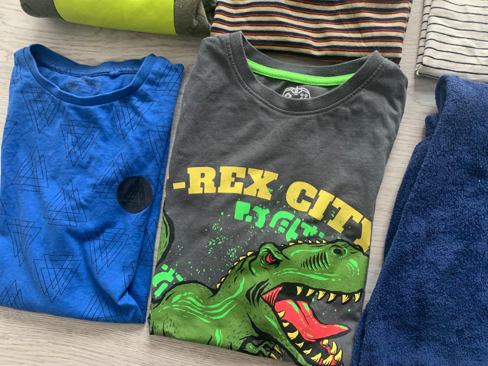 predám mix oblečenia pozostávajúci zo šiestich kúskov: Minecraft mikina F&F veľkosť 140 (9-10 rokov), pásikavé Next tričko čierno-oranžovo-červené 140 (10 rokov), biele Zara tričko s čiernymi pásikmi 134 (9 rokov), modré Next turistické tričko 140 (10 rokov), t-rex tričko f&f 146 (10-11 rokov), froté tmavomodré pyzamove nohavice k tomu grátis (146).