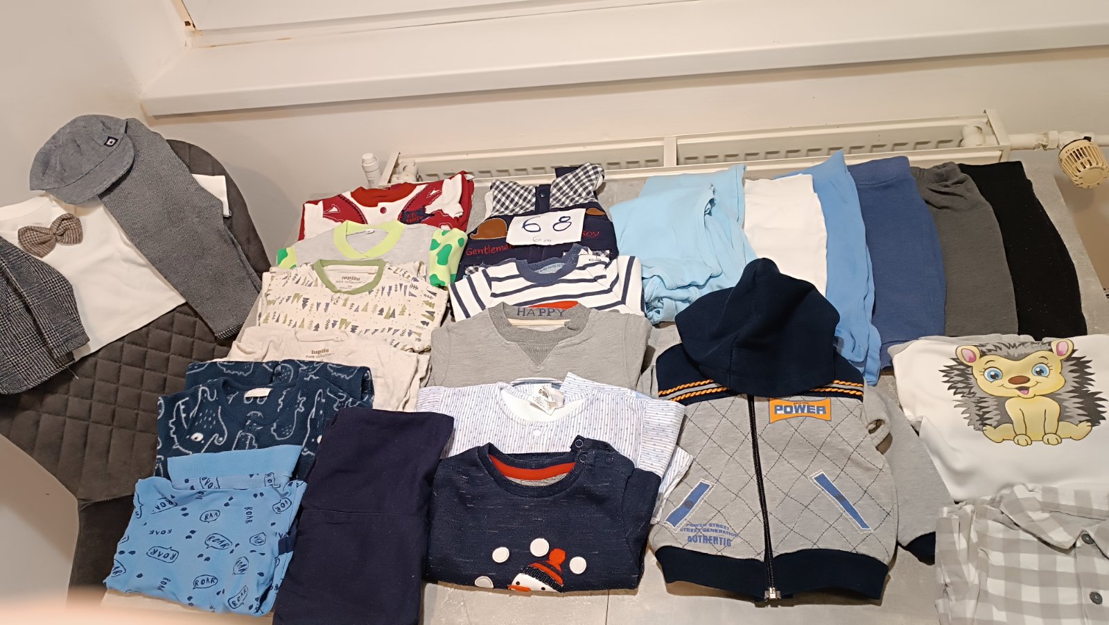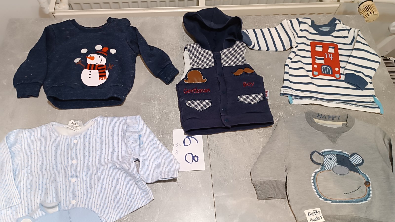 Veci sú nové, nosené bolo len: overal aMickey Mouse mikina na zips, sú tam veci s visačkou a ostatné veci bez visačky sú len opraté. Všetko je vo veľkosti 74. 1x súprava - tričko a tepláky (nové) ...