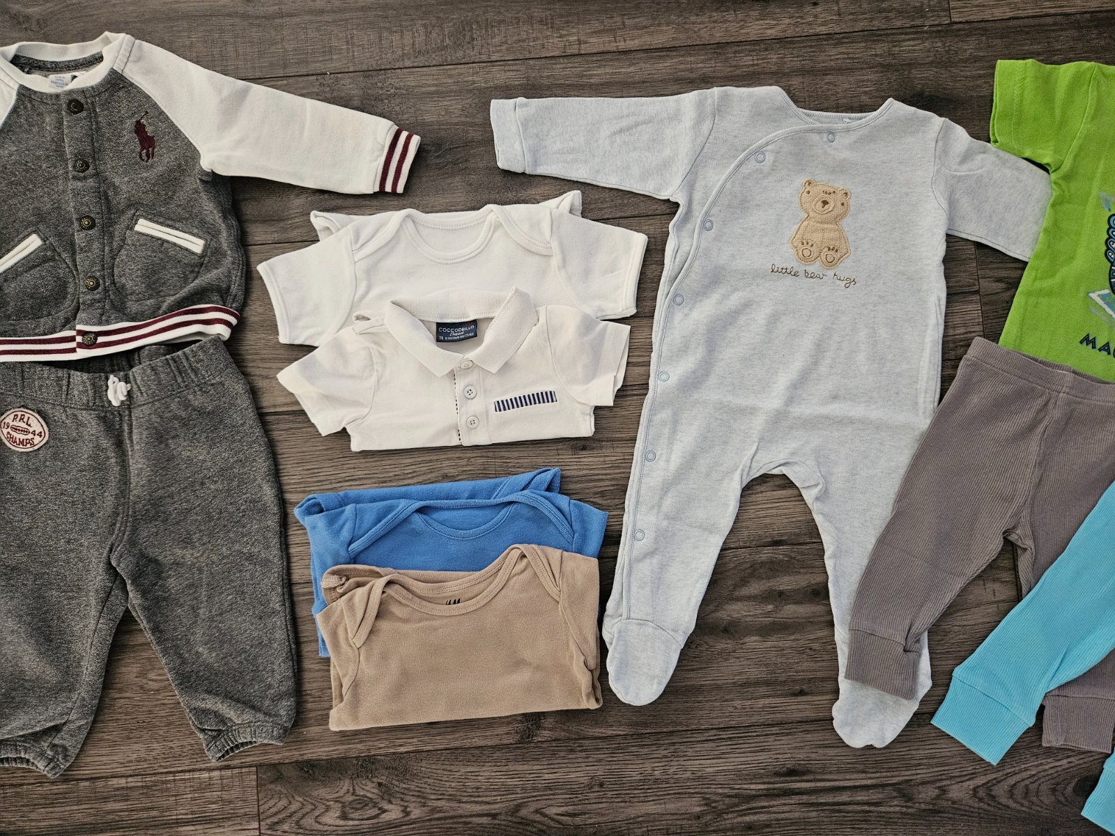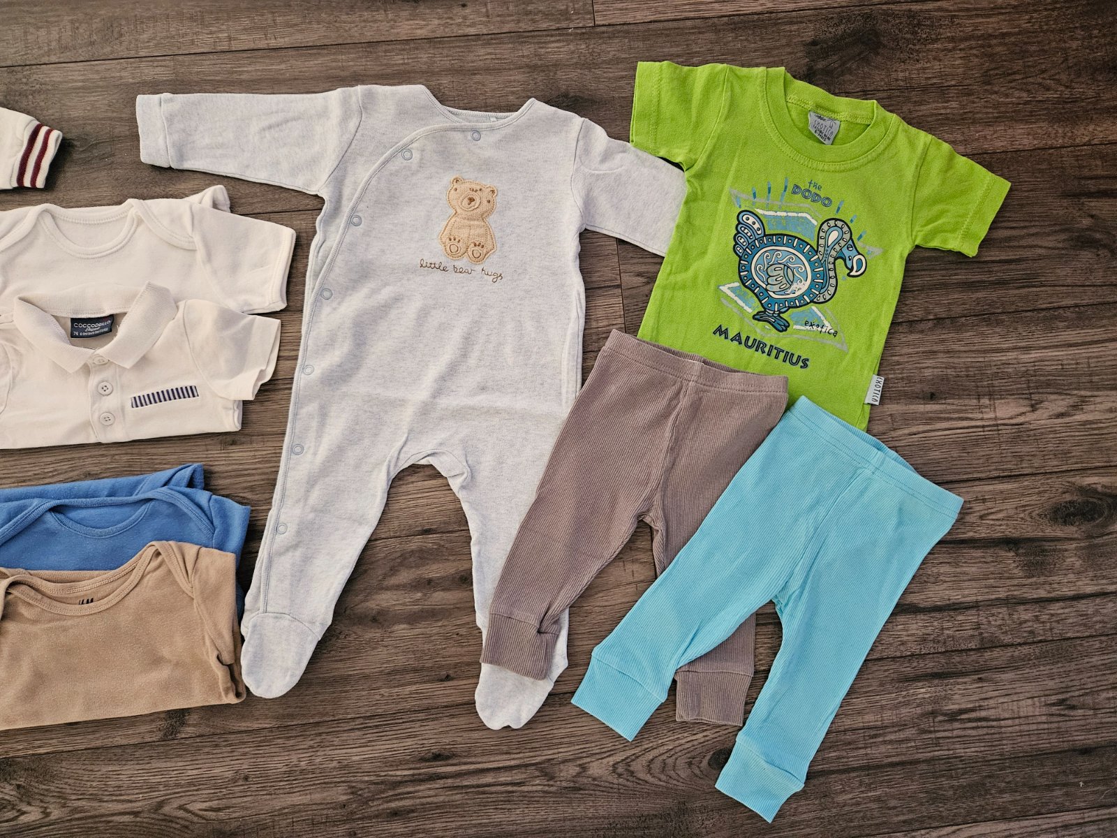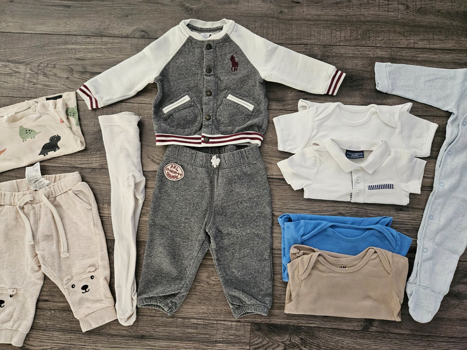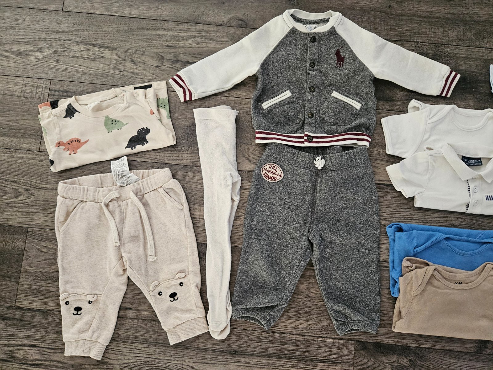 ● H&M- tepláky s mackom, hnedé body s dlhým rukávom, pančušky, tričko dino s dlhým rukávom
