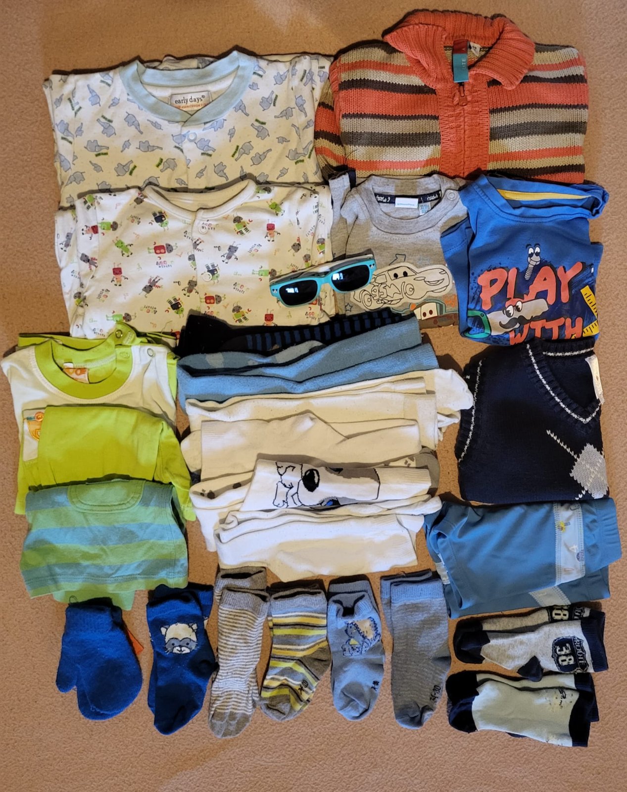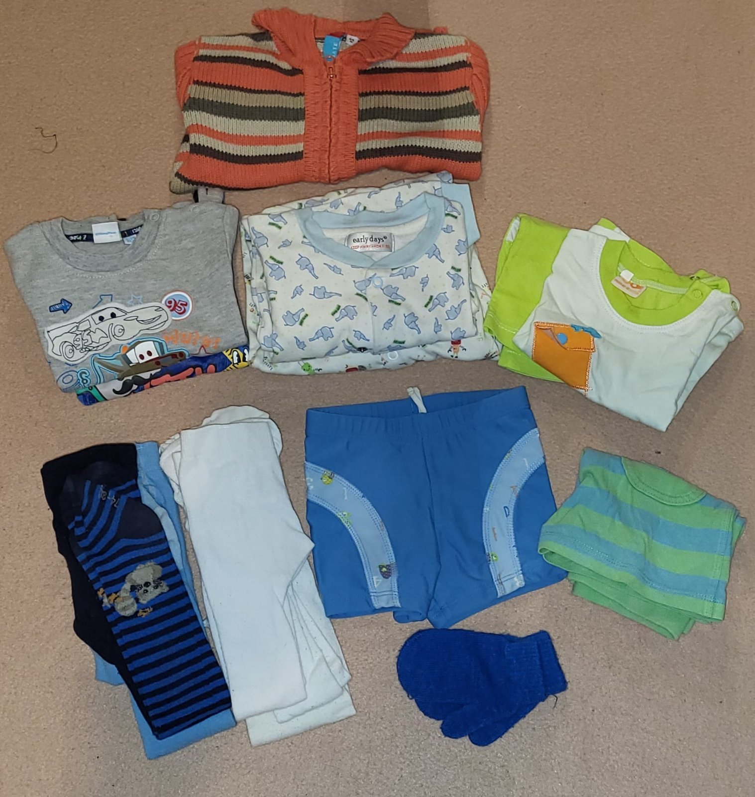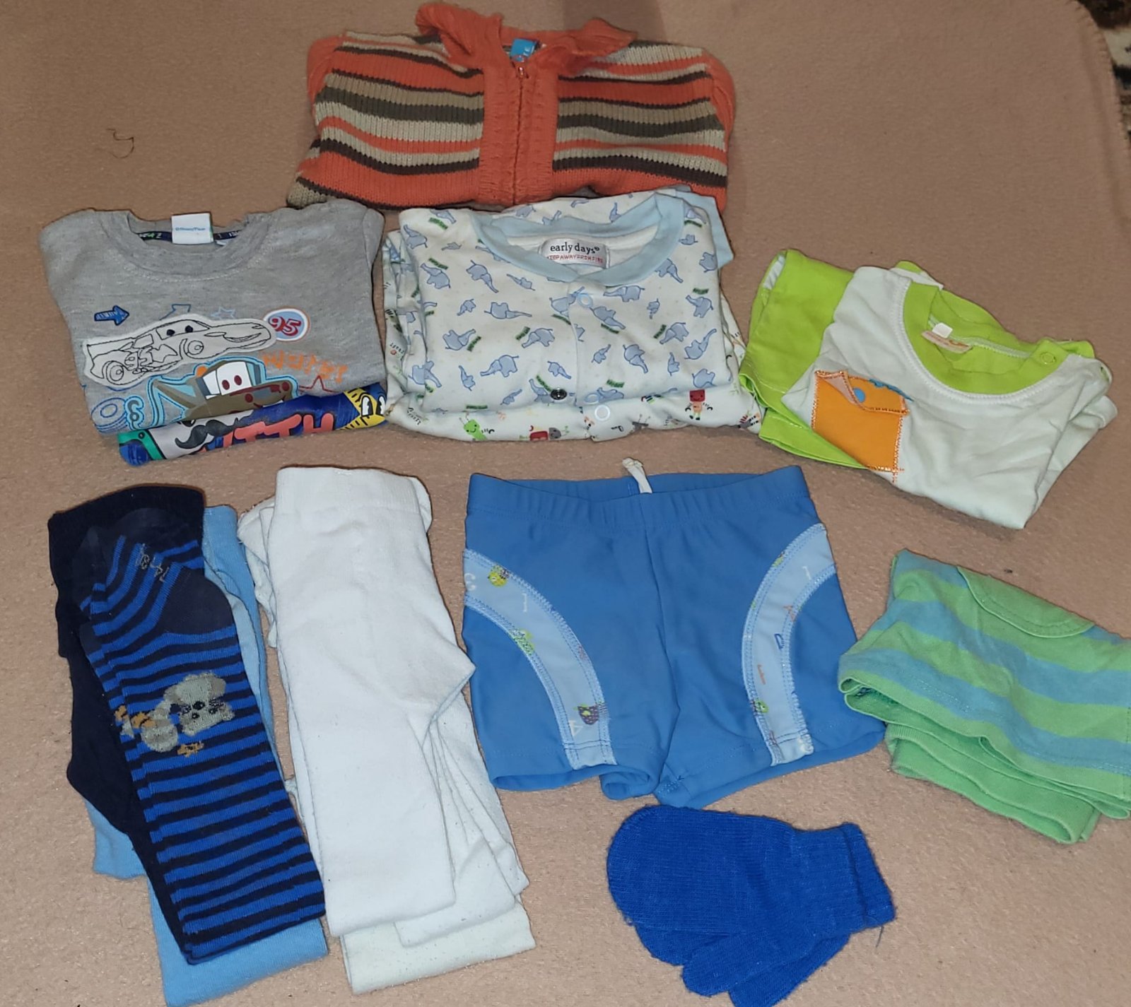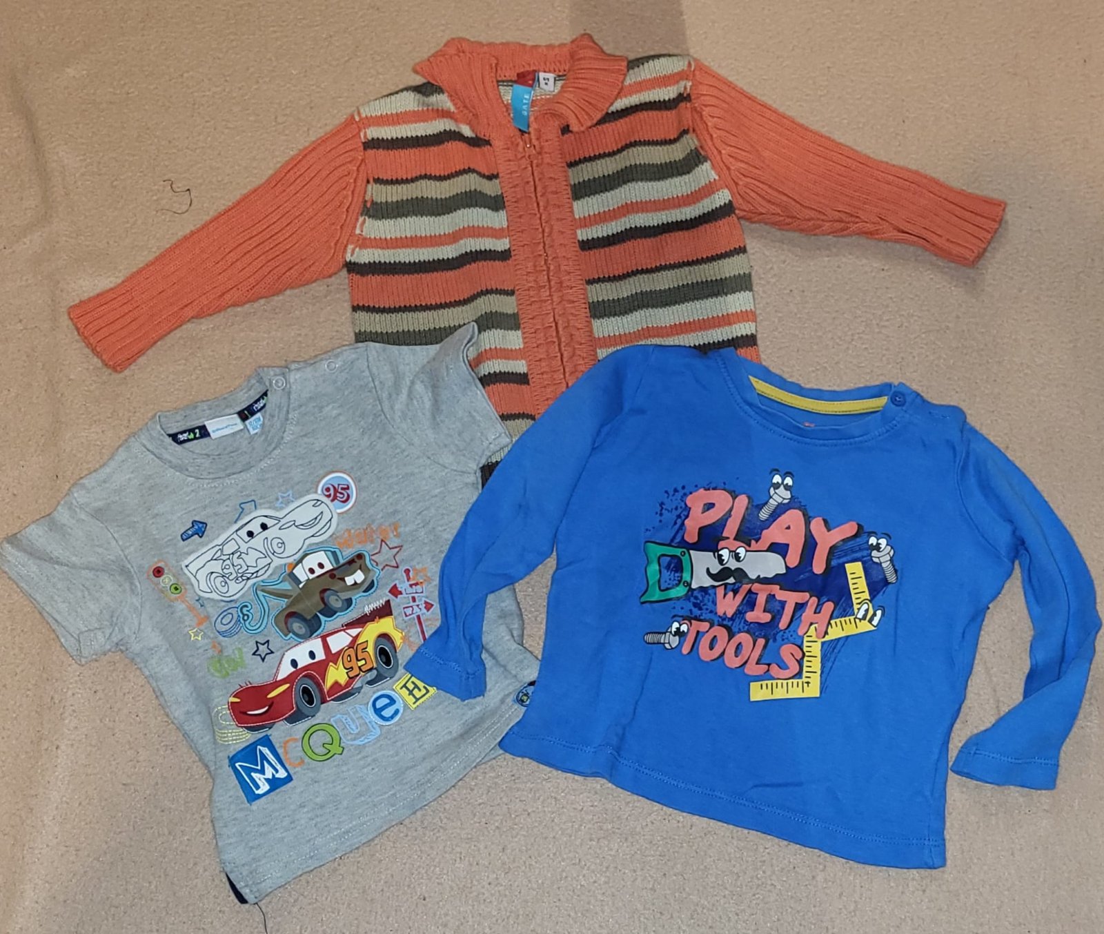 Veci sú nové, nosené bolo len: overal aMickey Mouse mikina na zips, sú tam veci s visačkou a ostatné veci bez visačky sú len opraté. Všetko je vo veľkosti 74. 1x súprava - tričko a tepláky (nové) ...