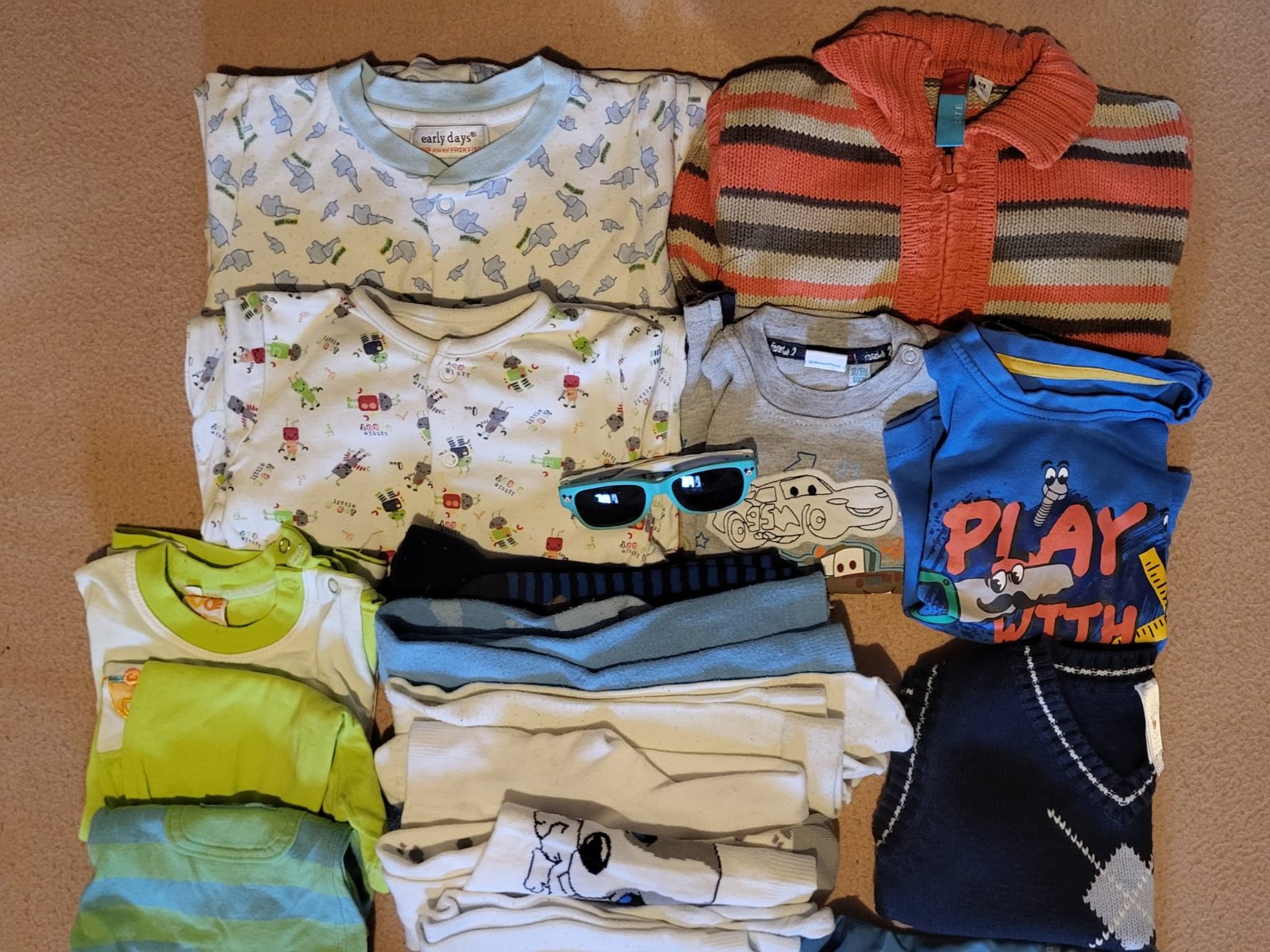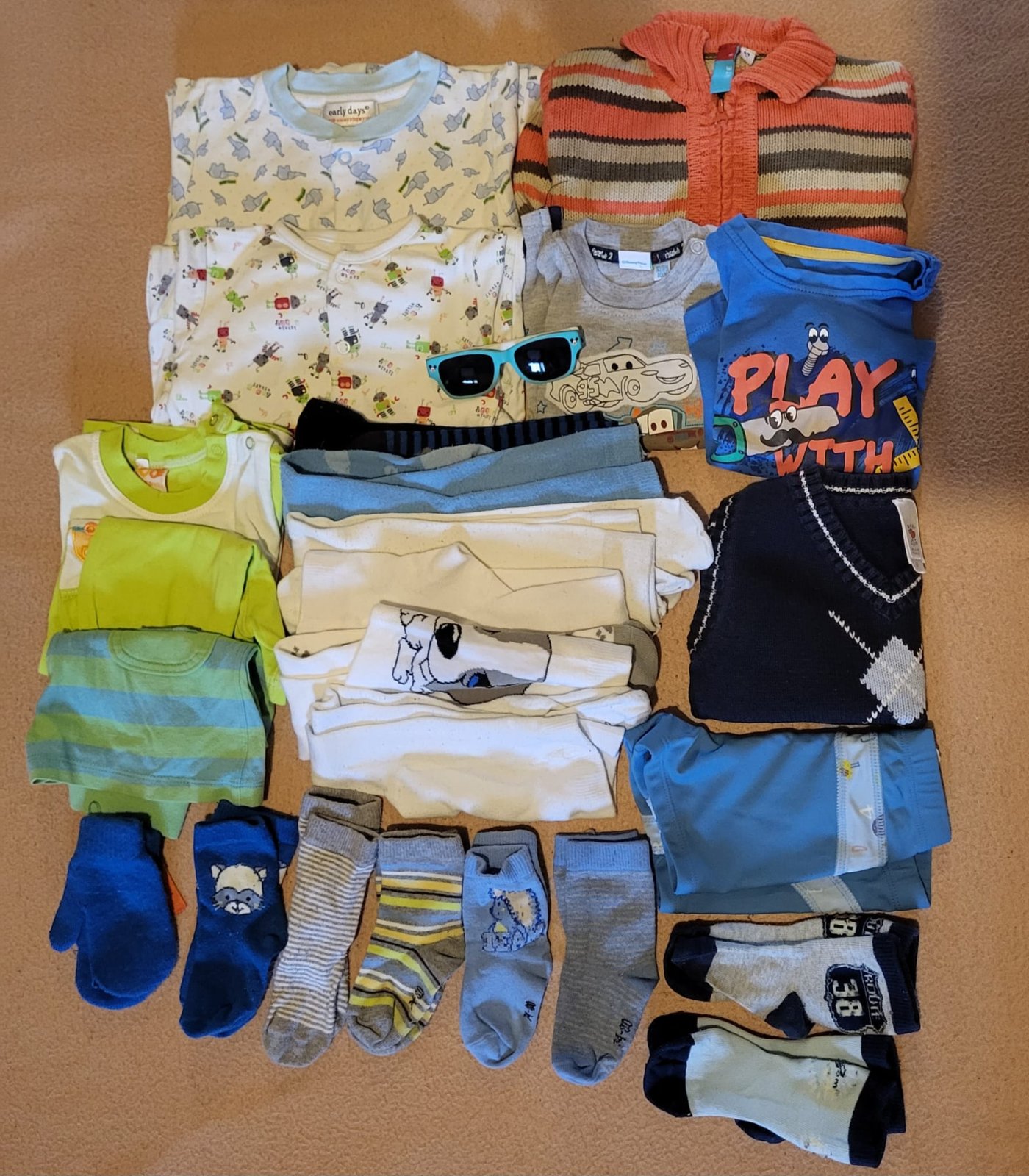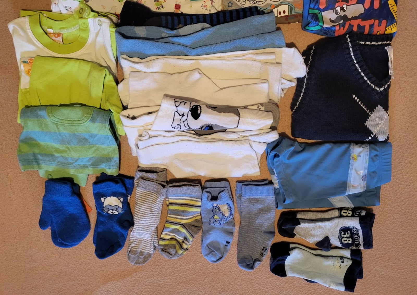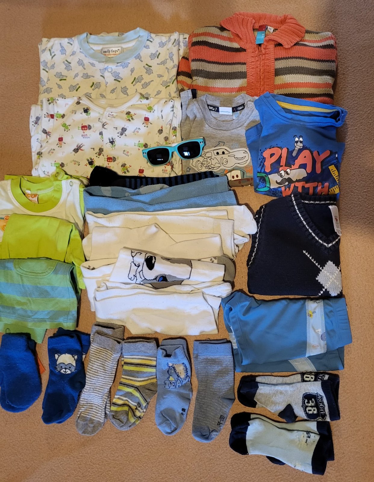 Veci sú nové, nosené bolo len: overal aMickey Mouse mikina na zips, sú tam veci s visačkou a ostatné veci bez visačky sú len opraté. Všetko je vo veľkosti 74. 1x súprava - tričko a tepláky (nové) ...