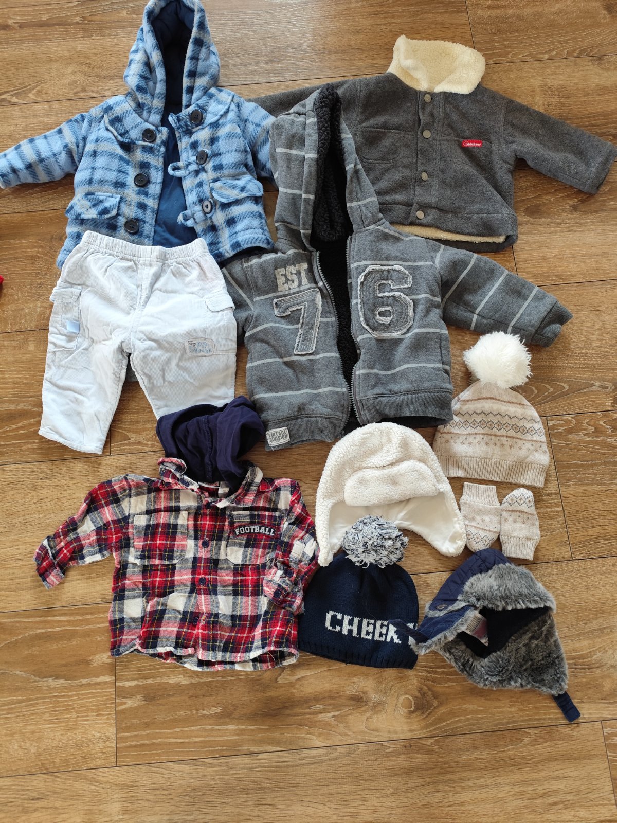 Balík oblečenia pre novorodenca,obsahuje 2 kabátiky,teplú mikinu,manchestrove nohavice, košieľku, 4 x čiapka,rukavičky. Všetko v top stave