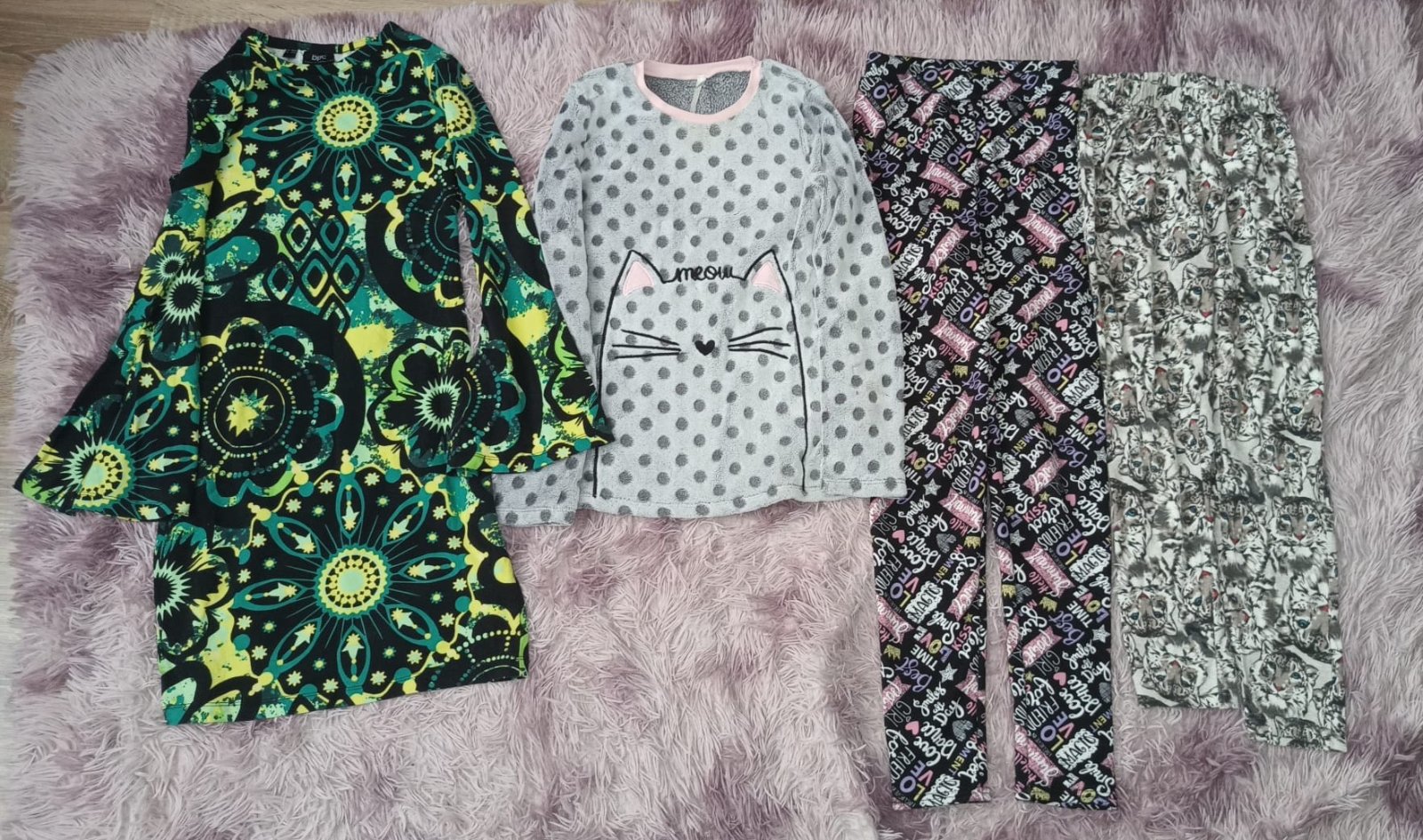 Obsah: Zelené vzorované šaty, pekná chlpatá mačkovská mikina, čierne legíny s nápismi sú perfektne zateplené a tenké tigrované legíny (veľ. 152/158).