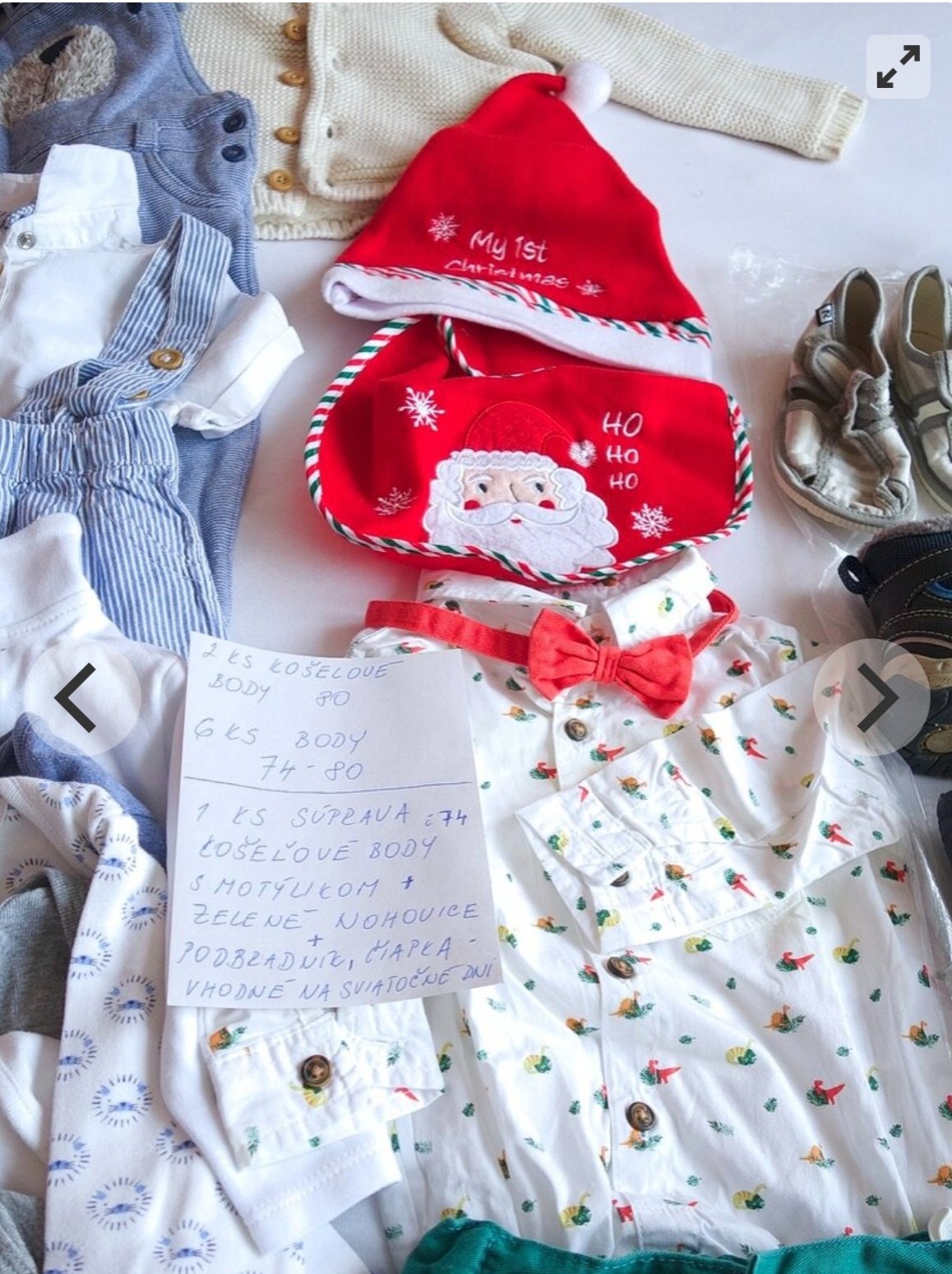 1ks súprava- biele košeľové body s červeným motýlikom a zelené nohavice 74 + červený podbradník a čiapka s Mikulášom (vhodné na sviatočné dni, spolu s čiapkou vhodné na Vianoce, na fotenie...)