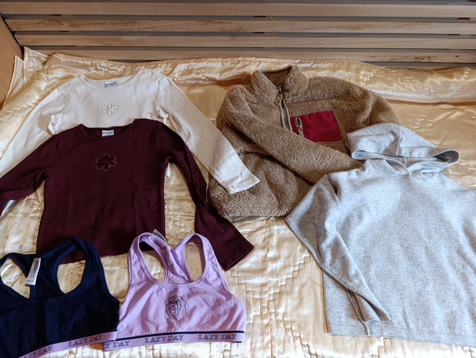 Mikinka 122, celková dĺžka 47cm vpredu , 50cm Rukáv 38cm Vpredu 2male fliciky od farby ( nie je to moc vidno) Tricko 122/128 , Celková dĺžka 44cm, Rukáv 44cm Na1 tukave na patente flak od farby