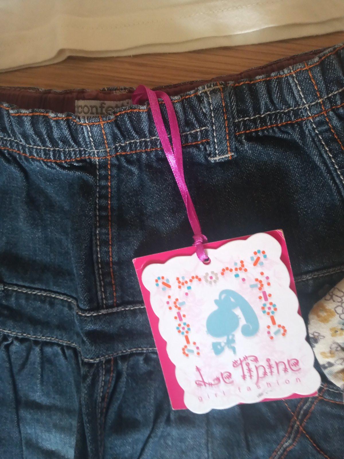 2. nenosenú riflovú sukňu luxusnej zn. confeti, veľ. 4 roky, super stav, dĺžka je 35 cm, šírka v páse je 25 cm