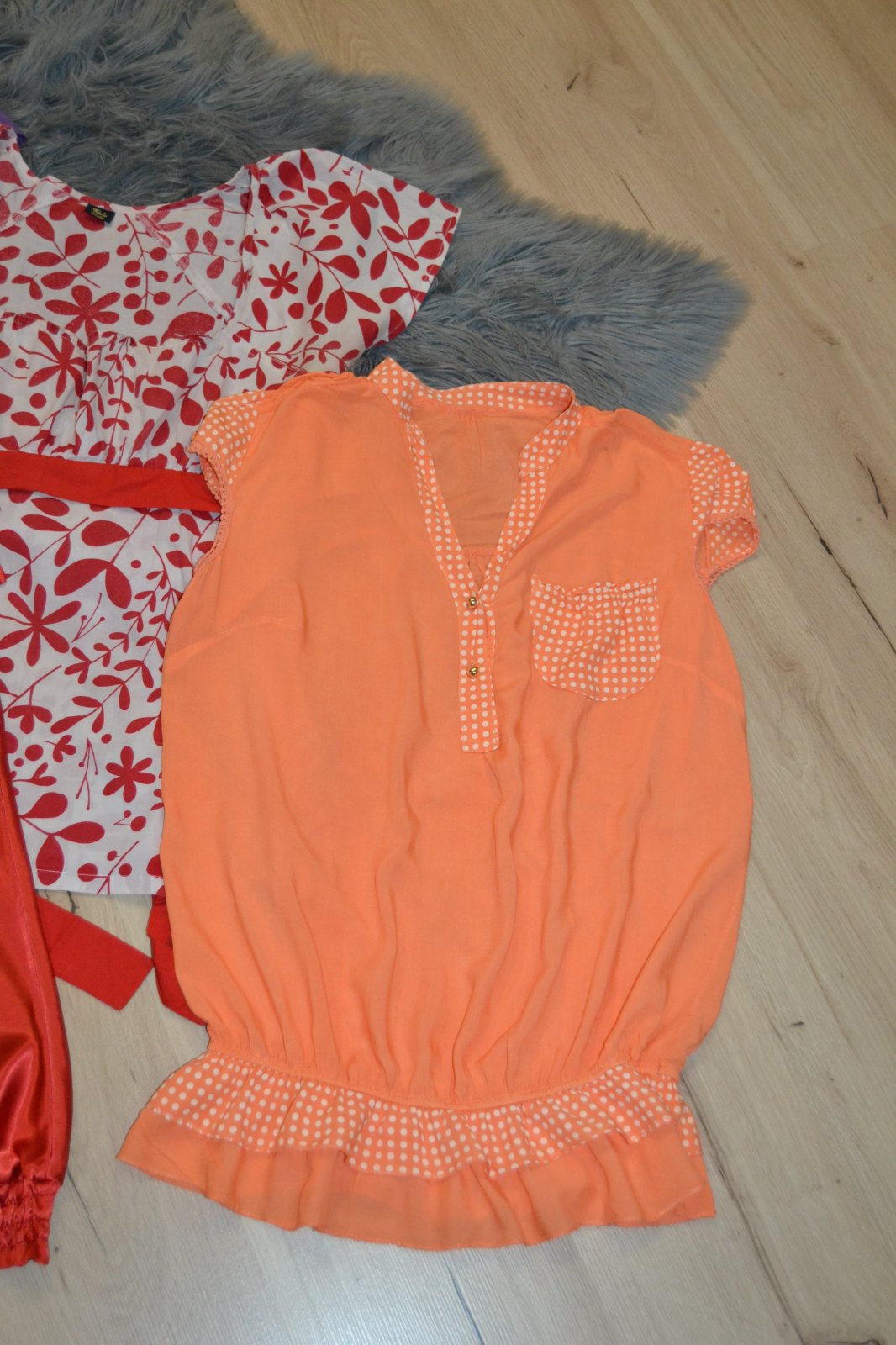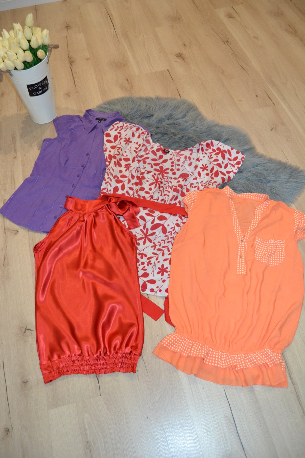 Balík dámskych elegantných blúzok zo strečového materiálu 4 ks/8e, veľkosť 38/M, farebne fialová, červená, biela, oranžová. Málo nosené v top stave.