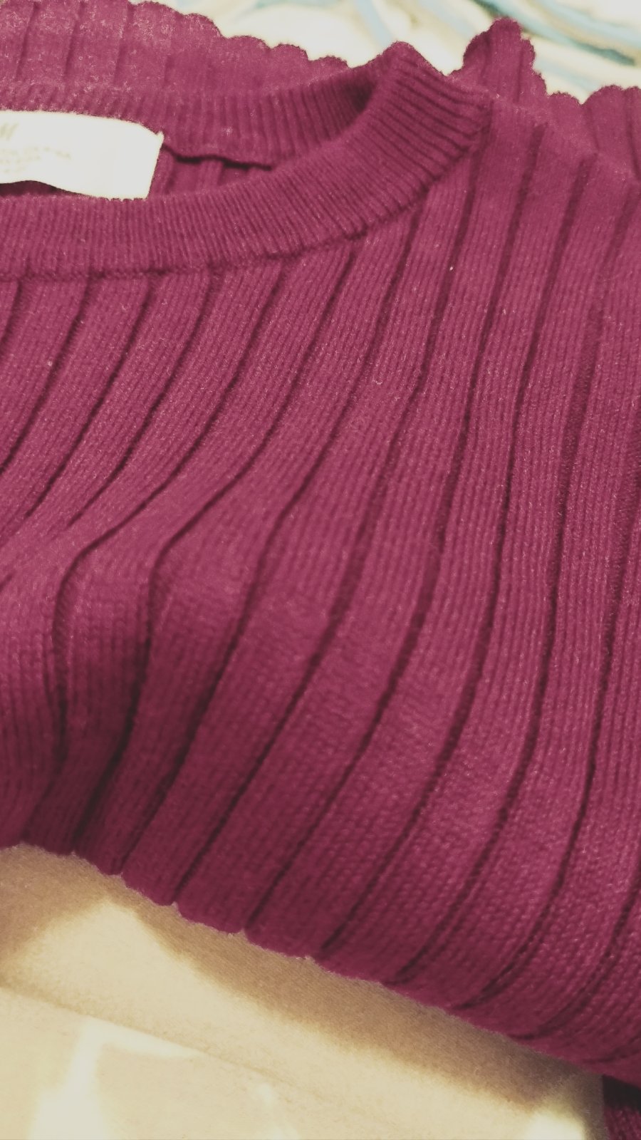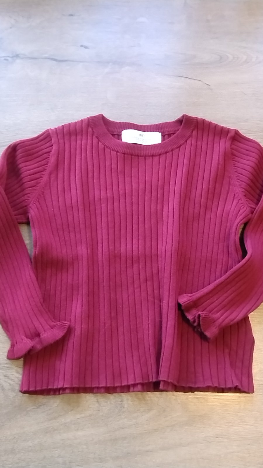 Balíček obsahuje: Tenký svetrík H@M. Veľkosť 4-6 rokov, podľa mňa skôr 5-6 rokov, bol len opratý. Veľmi jemný na nosenie, krásne ukončené rukávy. Je bordovej farby, zle sa fotila. Nie je do červena.