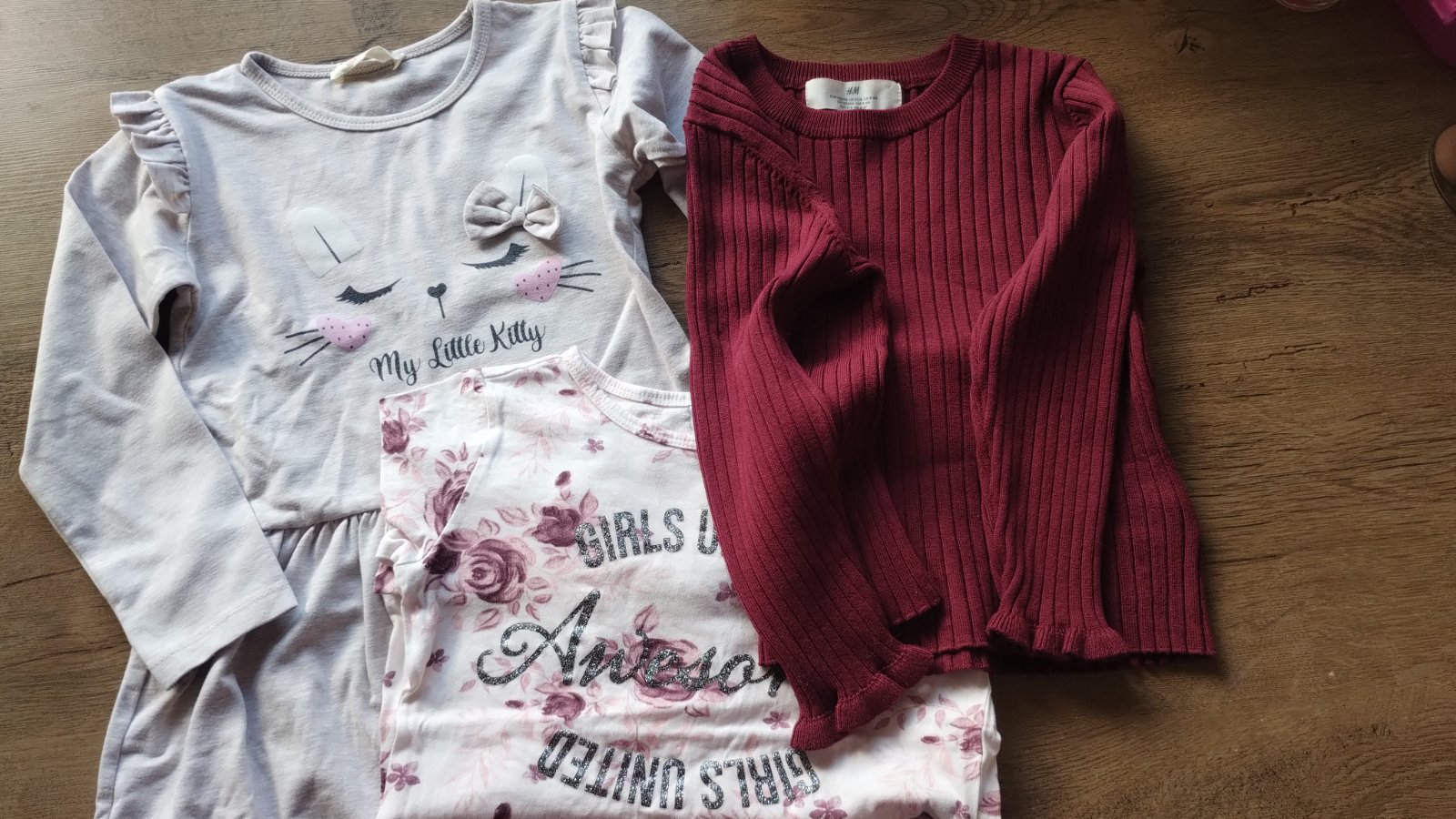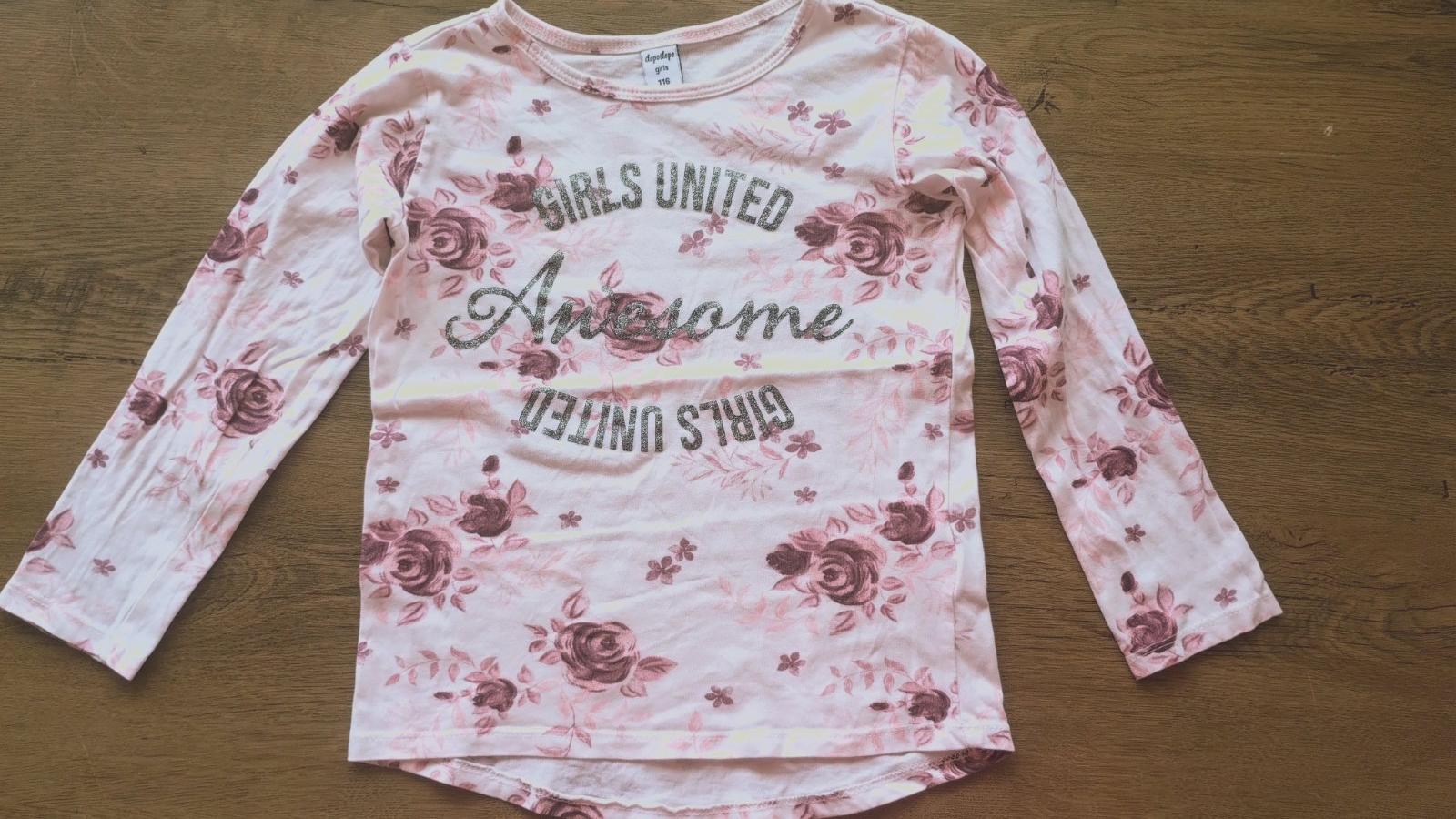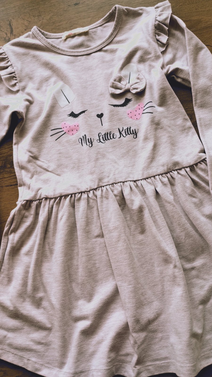 Tričko s ružičkami takko- bolo len opraté. Tričko má jemné trblietavé efekty, nedalo sa mi to odfotiť. Sivé šaty mačička. Predaj len spolu.