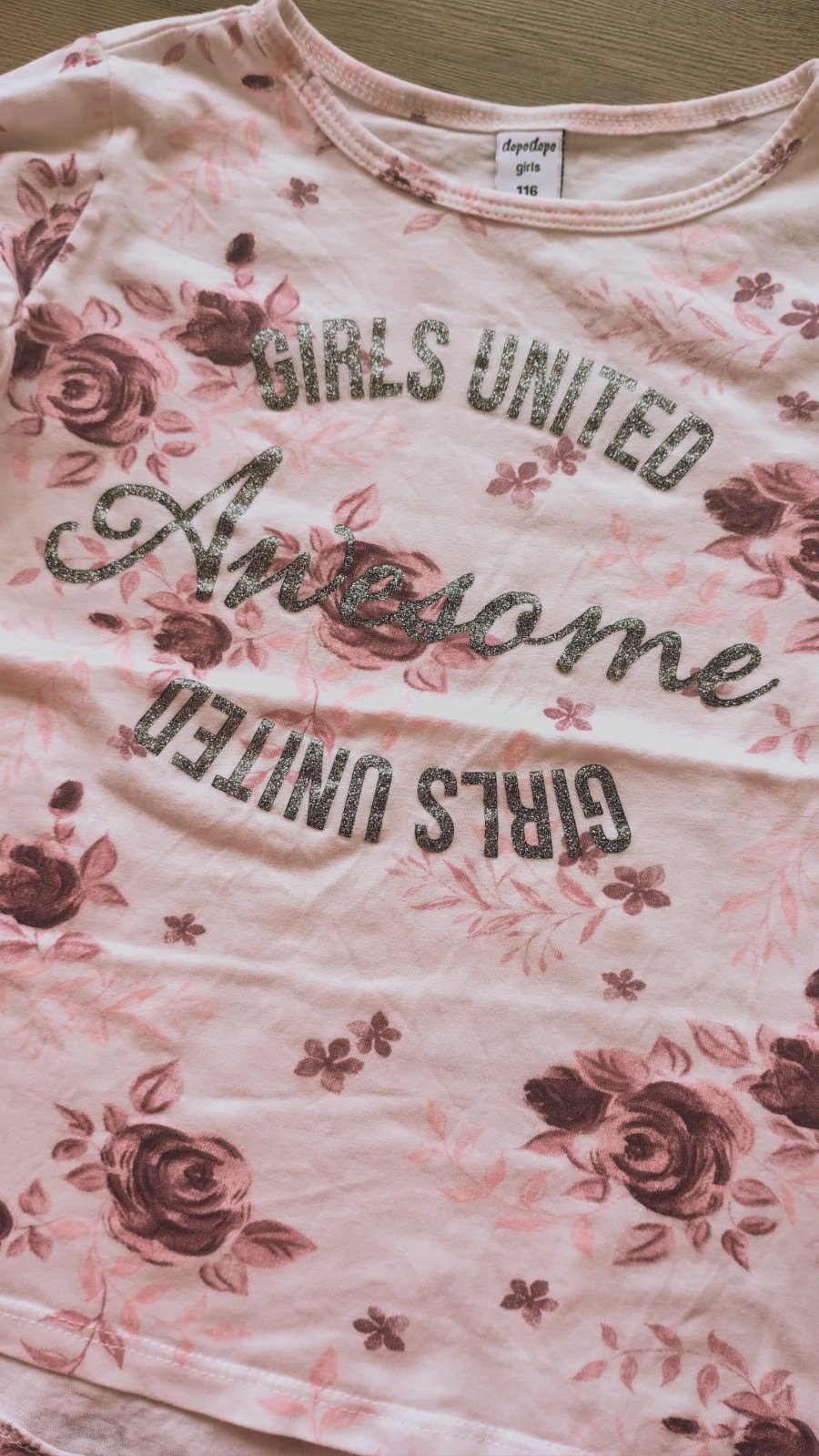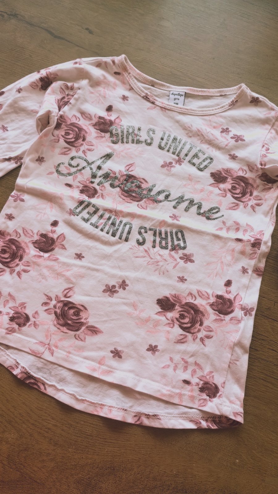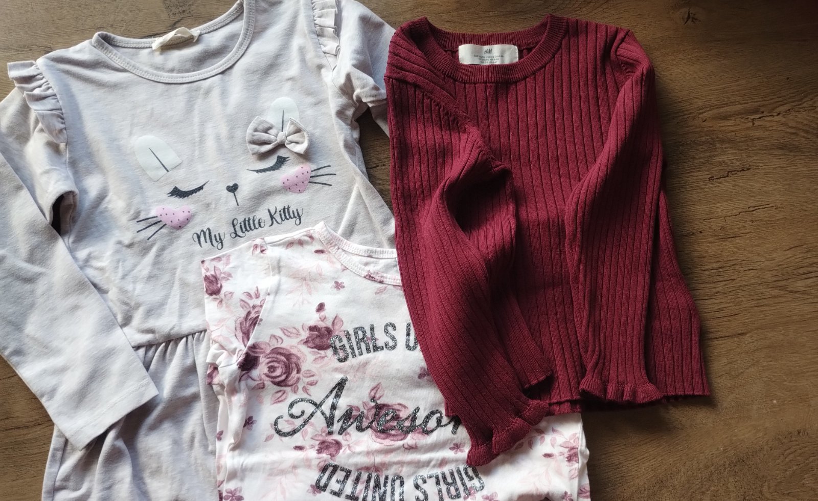 Tričko s ružičkami takko- bolo len opraté. Tričko má jemné trblietavé efekty, nedalo sa mi to odfotiť. Sivé šaty mačička. Predaj len spolu.