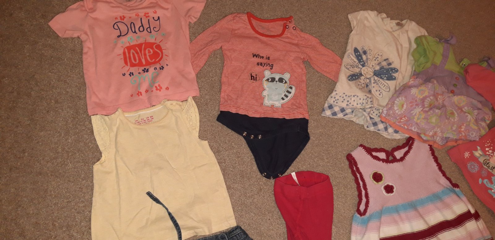 Balík oblečenia na donosenie (mix veľkosti) - 1x pyžamko, 2x nohavice (ružové sú teplejšie), 3 tričká. Naše dievčatá nosili cca od 6 - 12mes. Vecičky sú s fliačikmi, žlté nohavice vyšúchané kolienk...