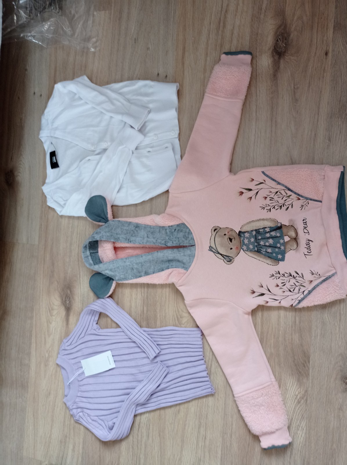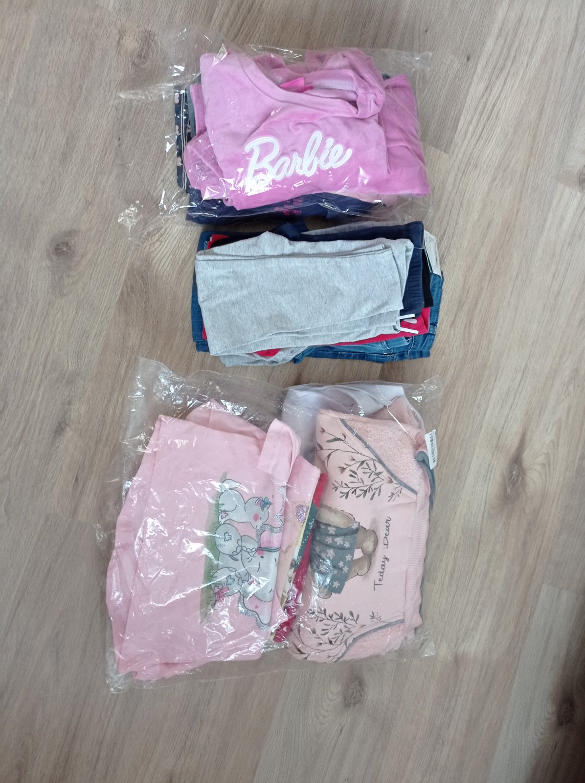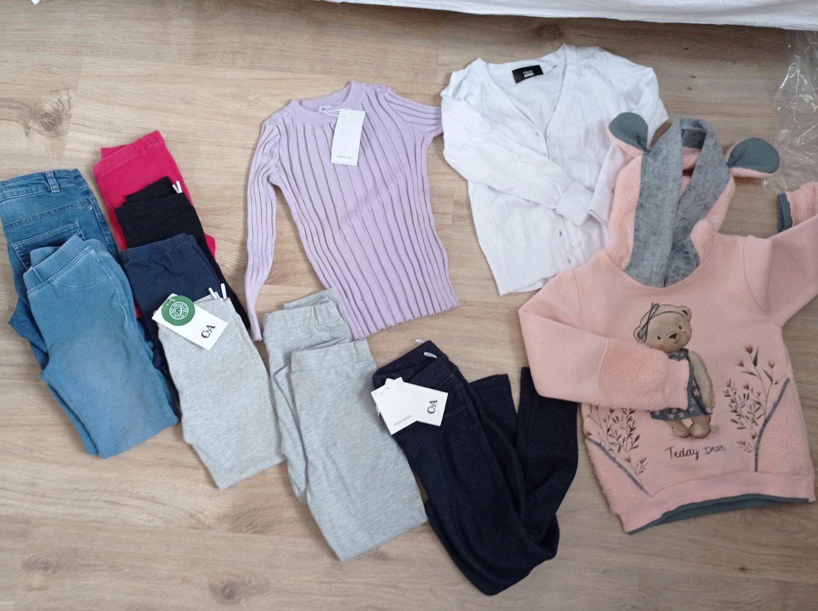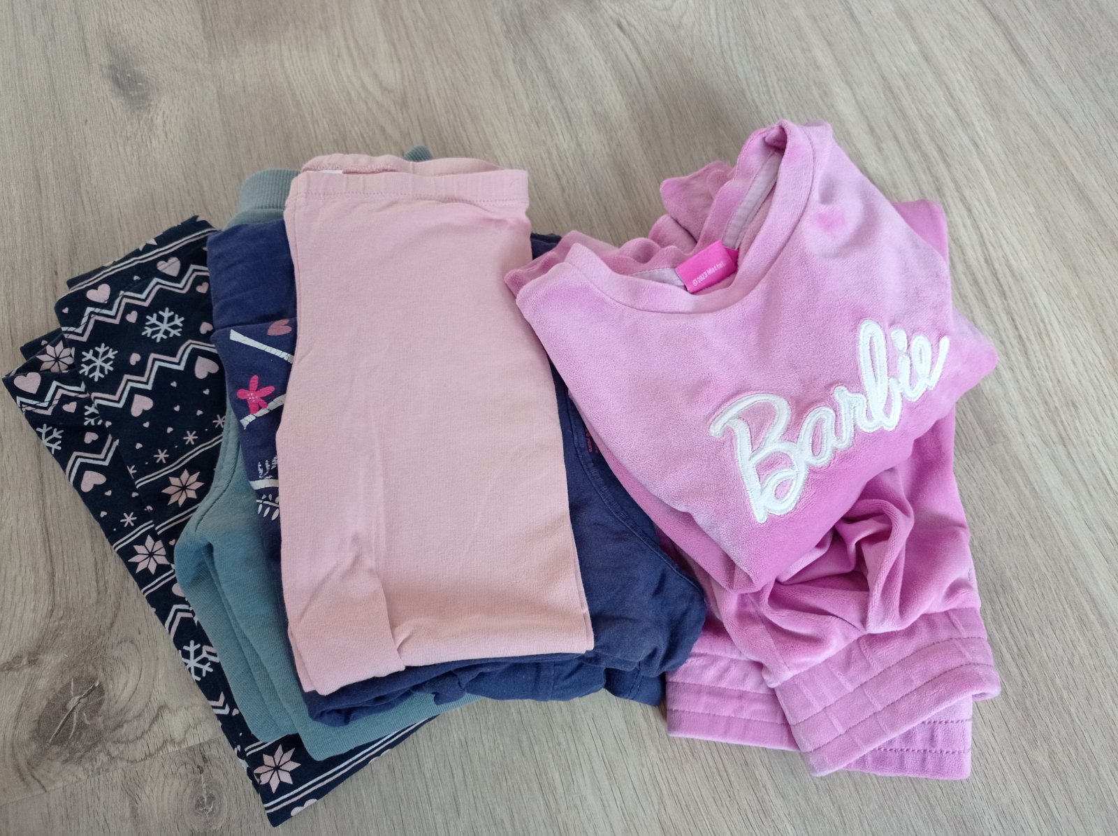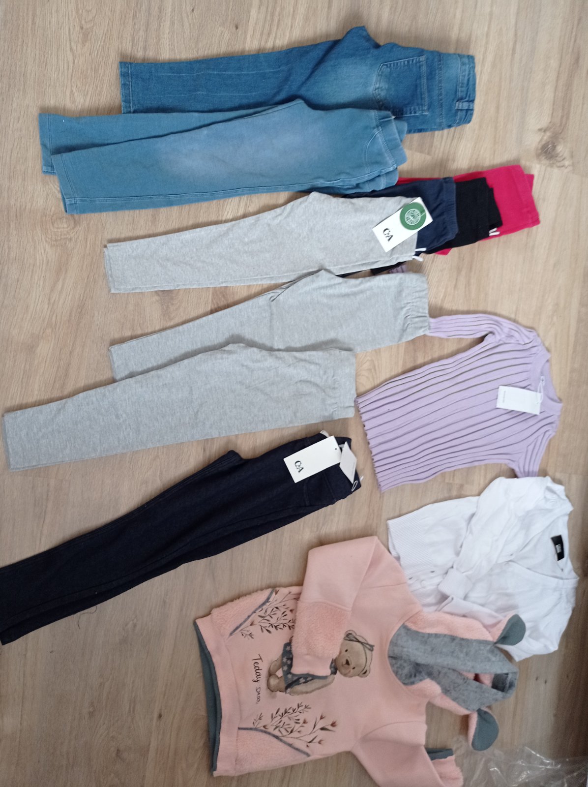 Šedé legíny sú všetky nové , biely svetrík je značky Next- nový, fialový značky reserved - nový a mikina s údajmi je bez známok nosenia.