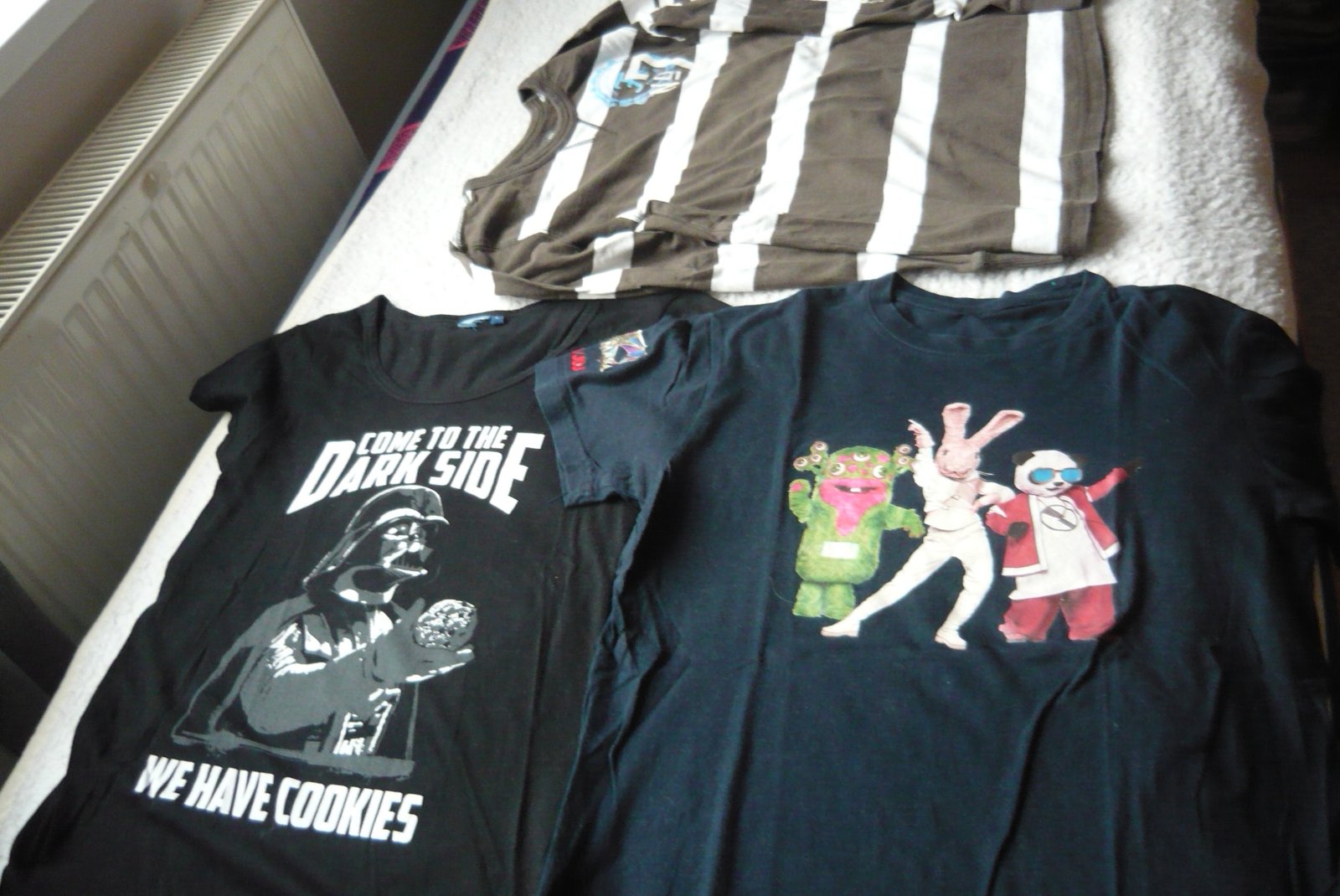 pásikavé tričko s dlh.rukávom č. 146/152 . zn.H§M, cez prsia 44 cm, bavlna. čierne zn.Star Wars, píše č.L cez prsia 43 cm, 100% bavlna,. čierne tričko s 3 postavami, cez prsia 46 cm, bavlna. Cena spolu 6 eur